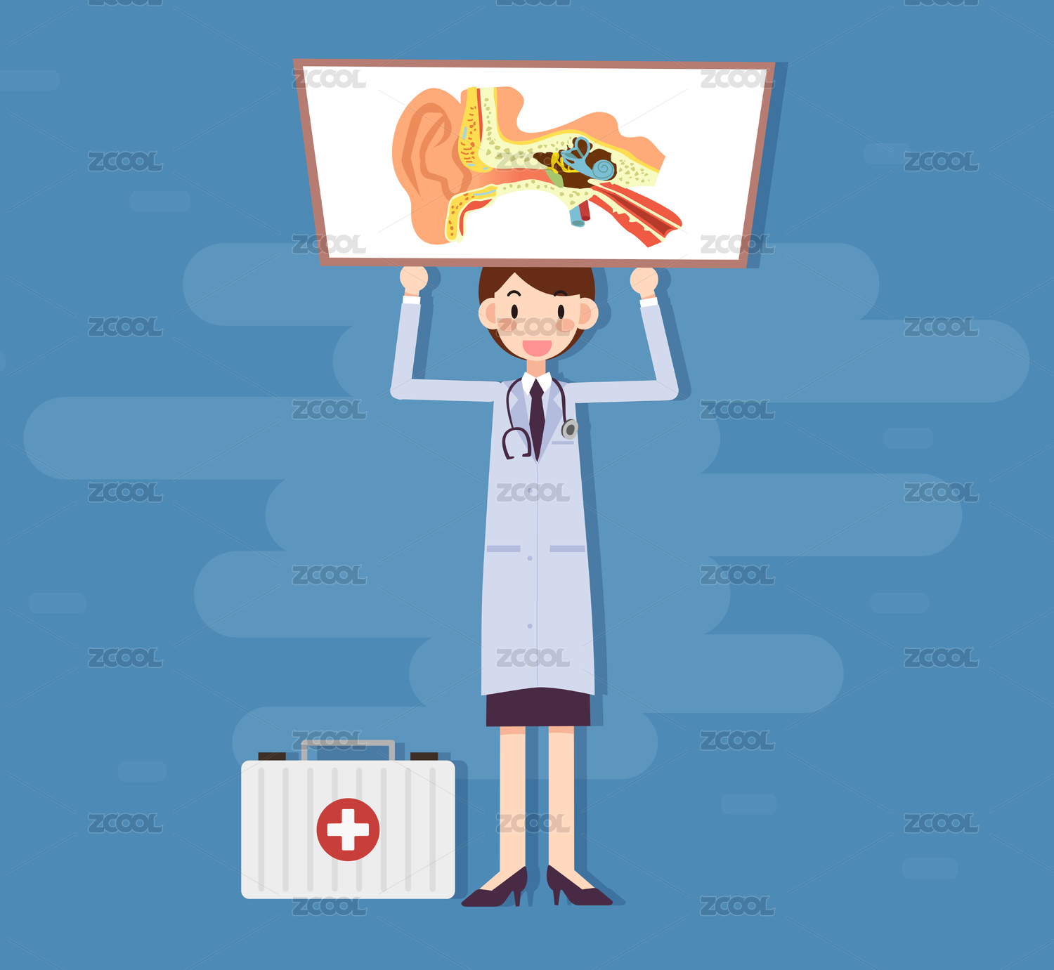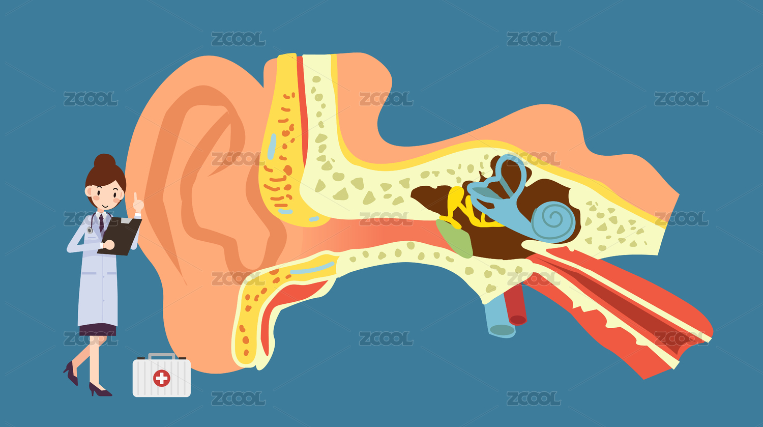 女医生在耳朵前的健康医疗概念矢量图