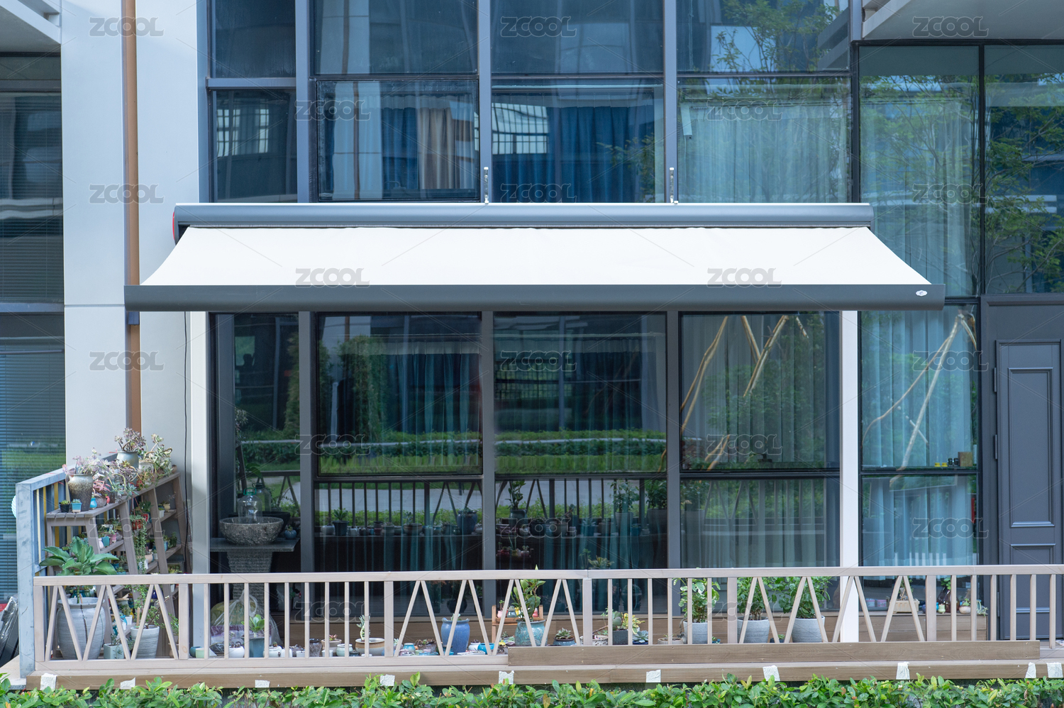 白色墙壁上红白相间的遮阳棚和玻璃窗