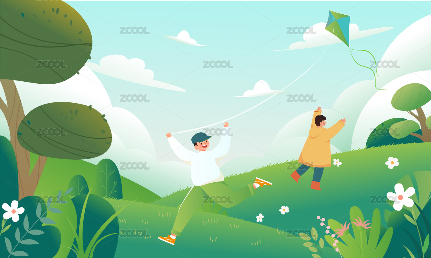 小孩子出游放风筝插画