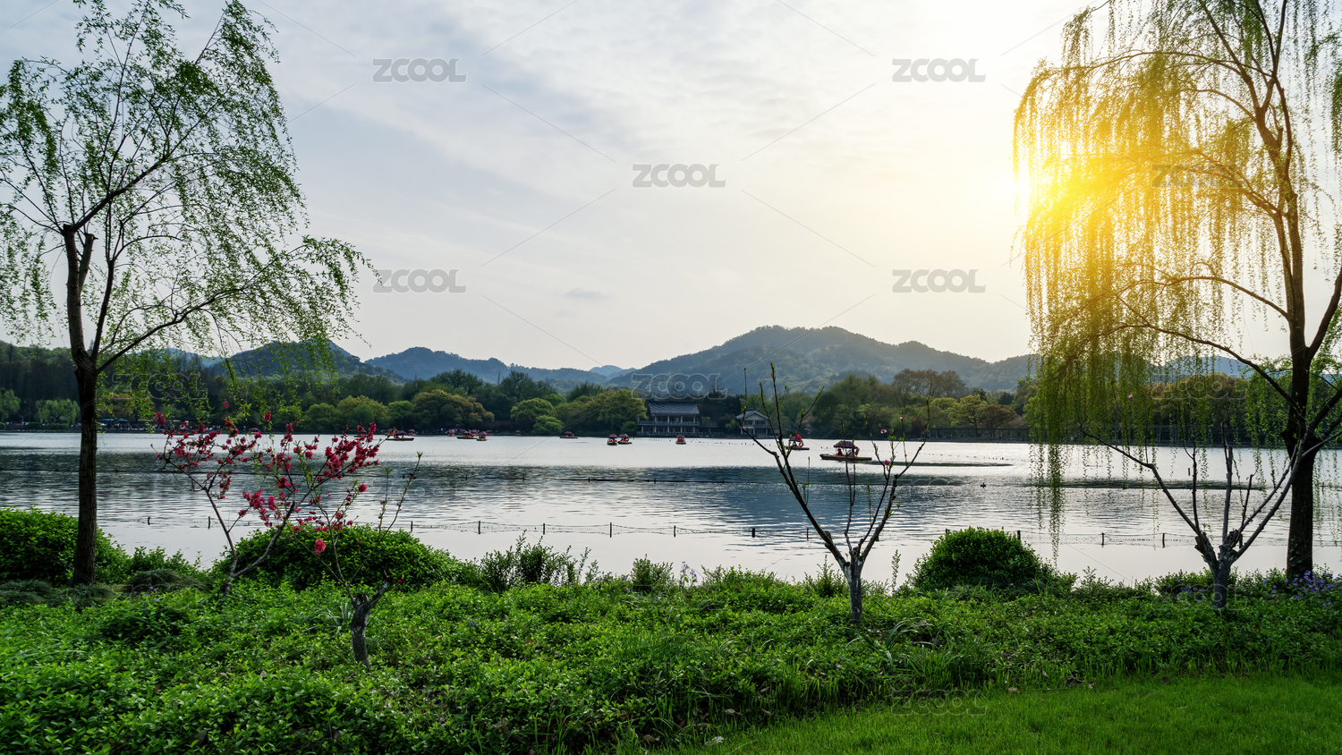 日落下的西湖山水