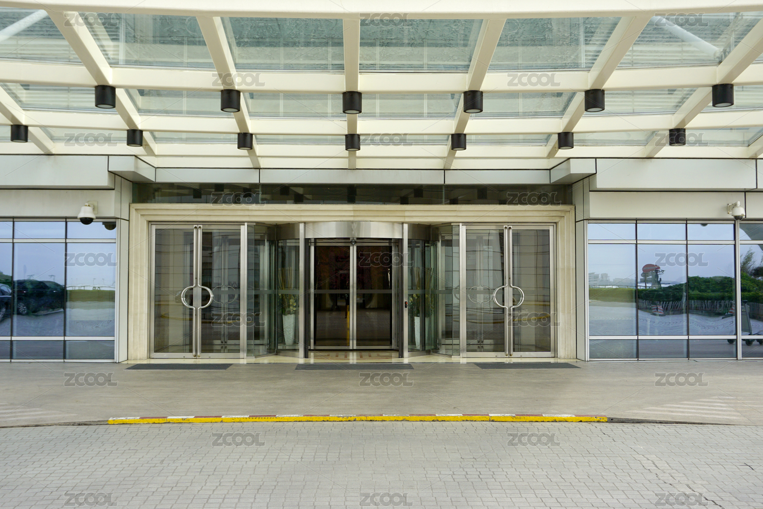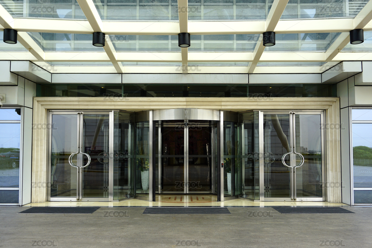 现代建筑大堂处的门庭及玻璃门