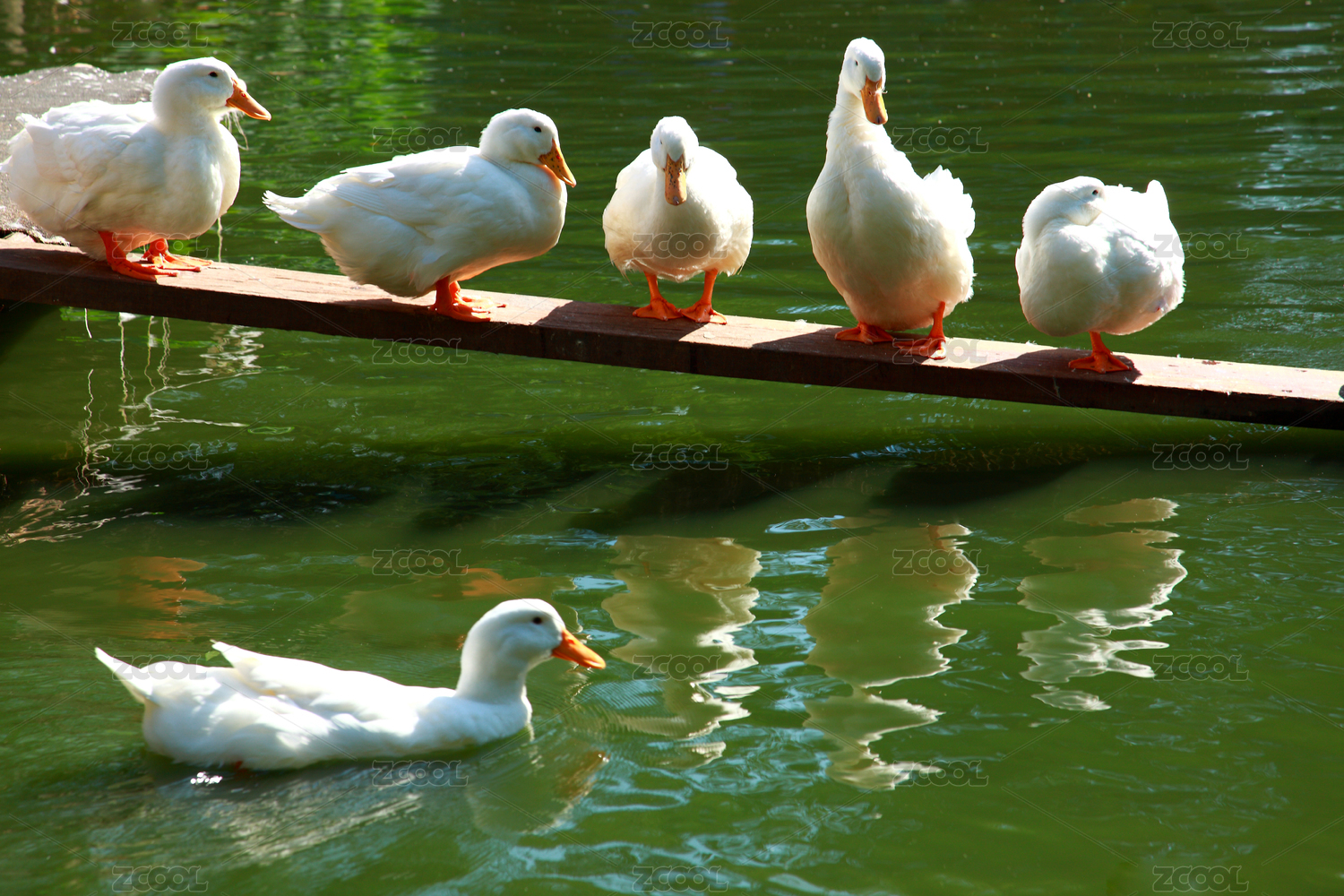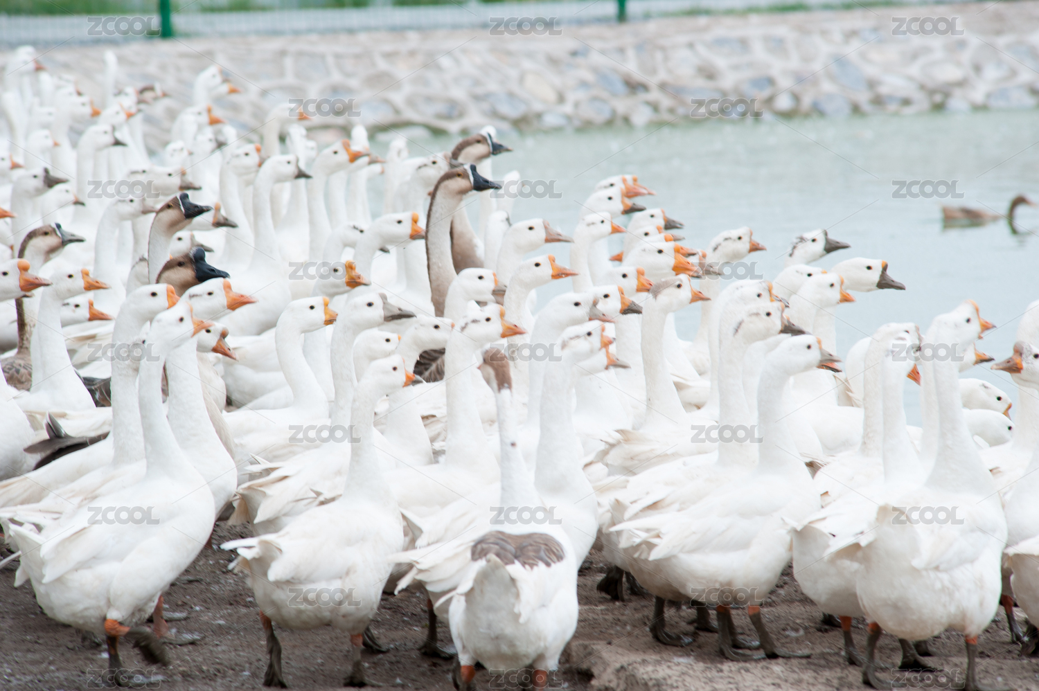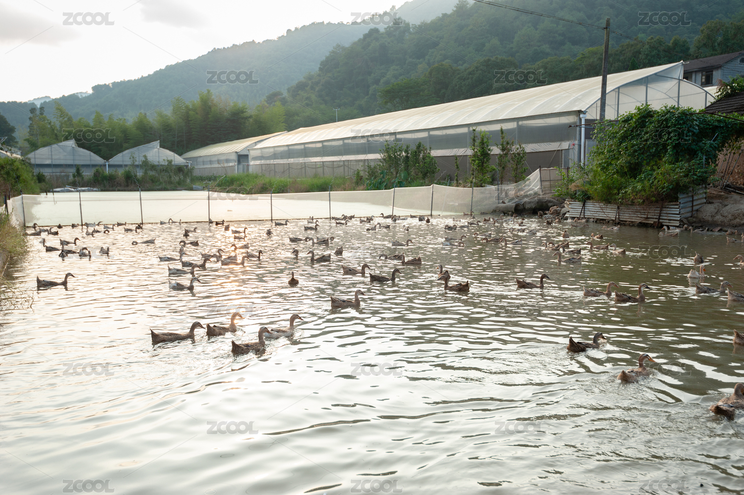农村里农场养的一群鸭子游水