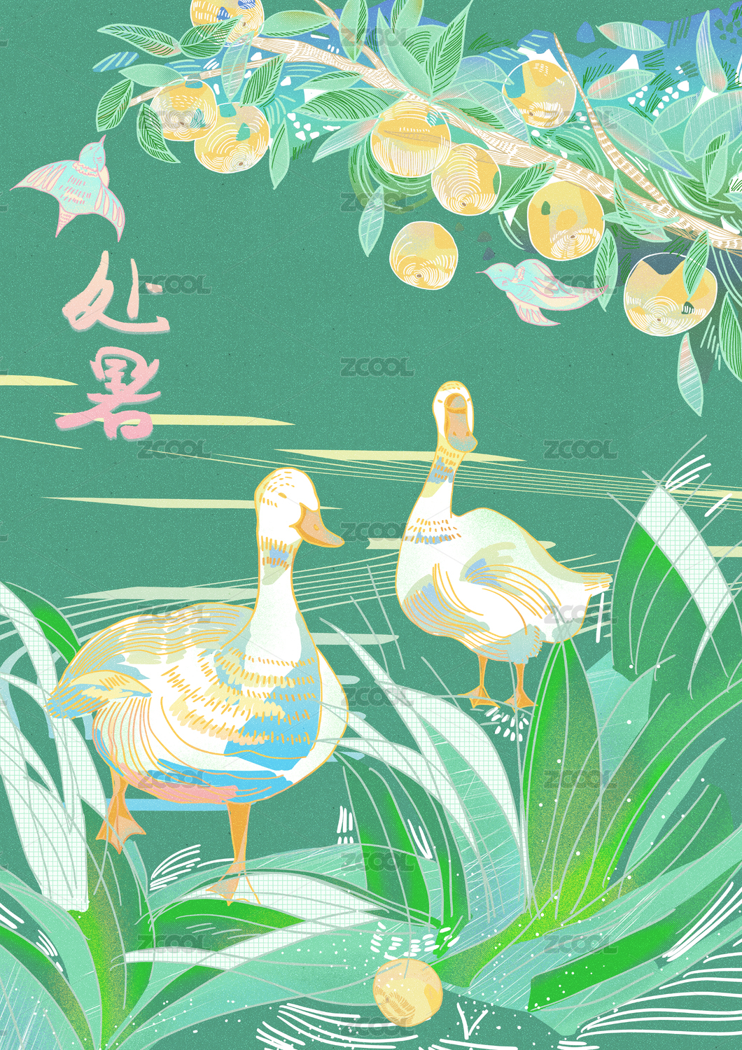 在梨树下鸭子想要跨过草丛的二十四节气中处暑的插画图案设计