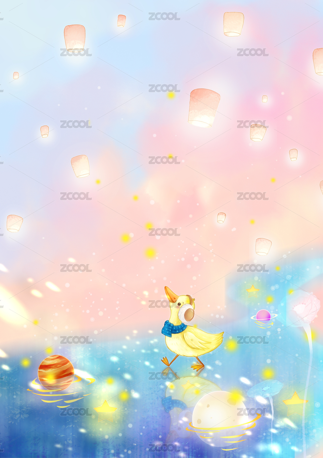 彩色云霞下满是孔明灯的天空和鸭子