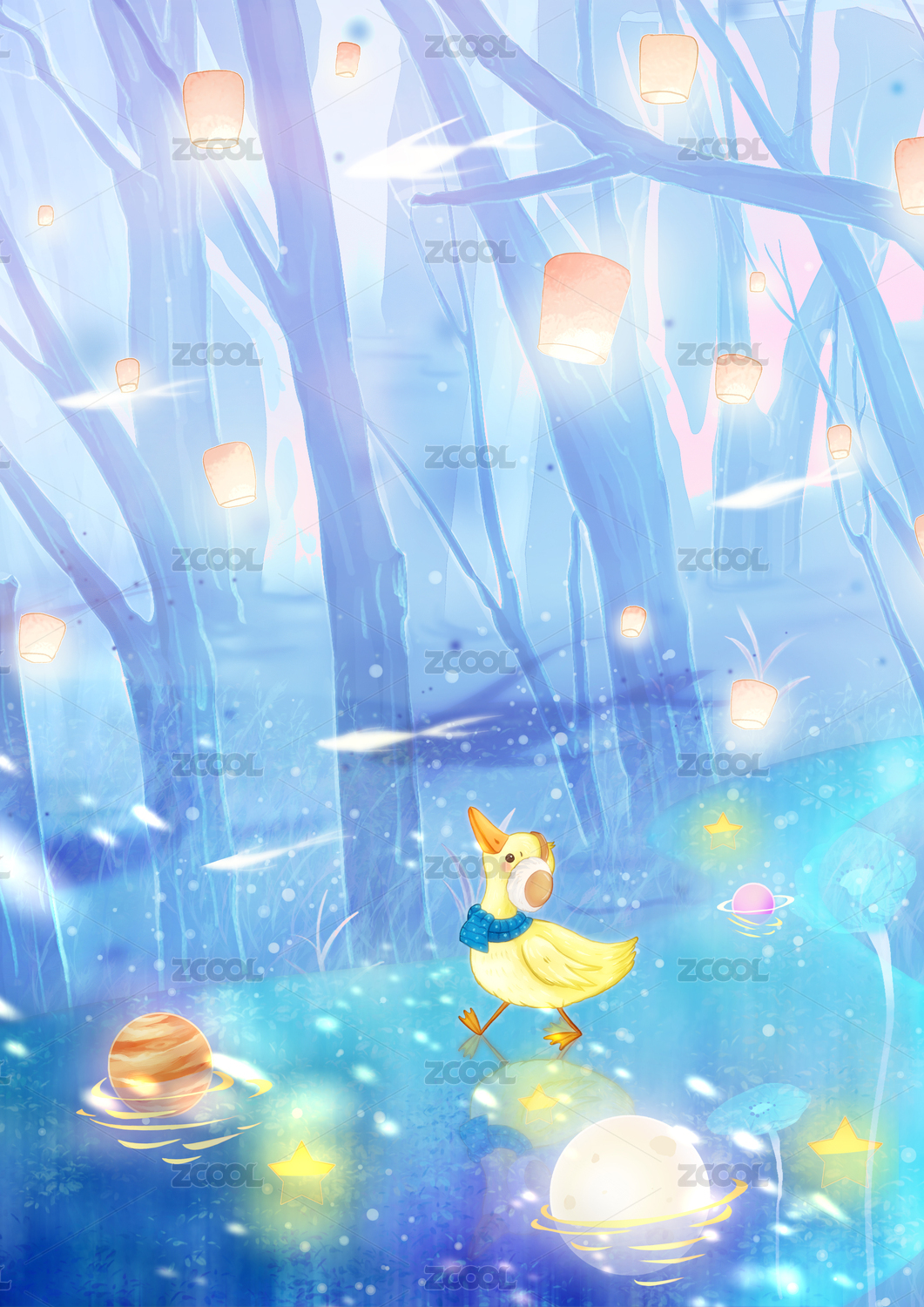 在满是孔明灯的树林里踱步的小鸭子