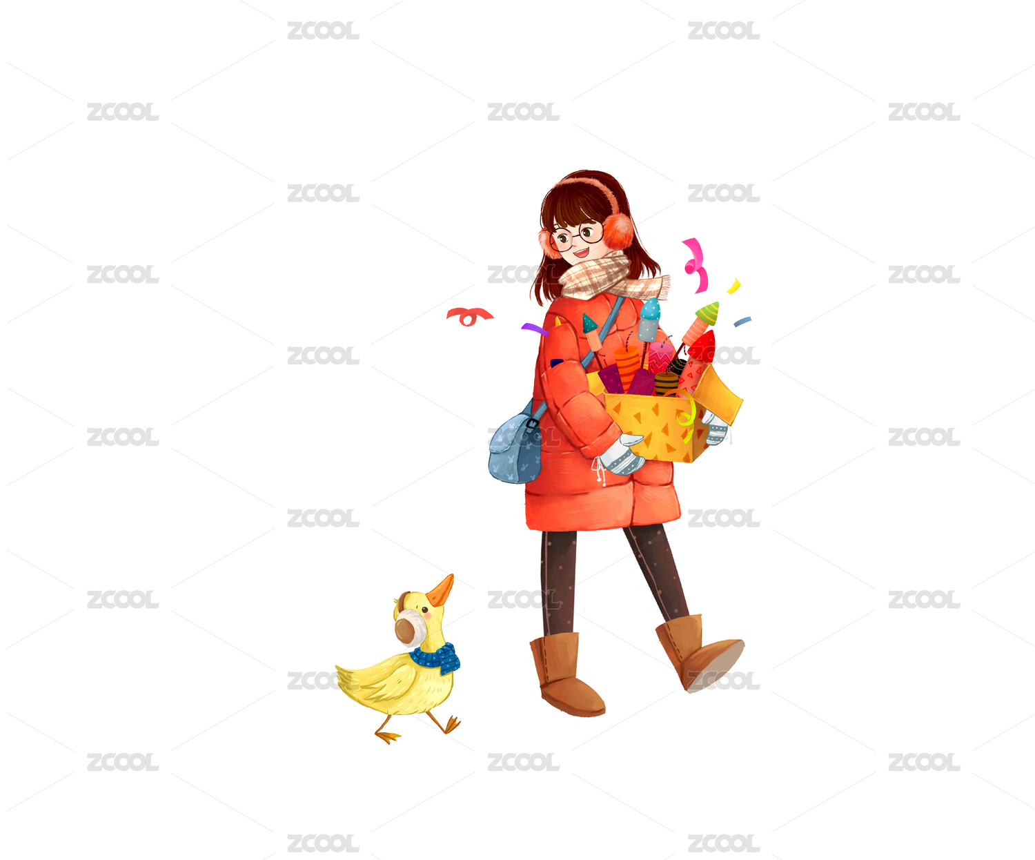抱着一箱烟火爆竹和鸭子走在路上的小女孩
