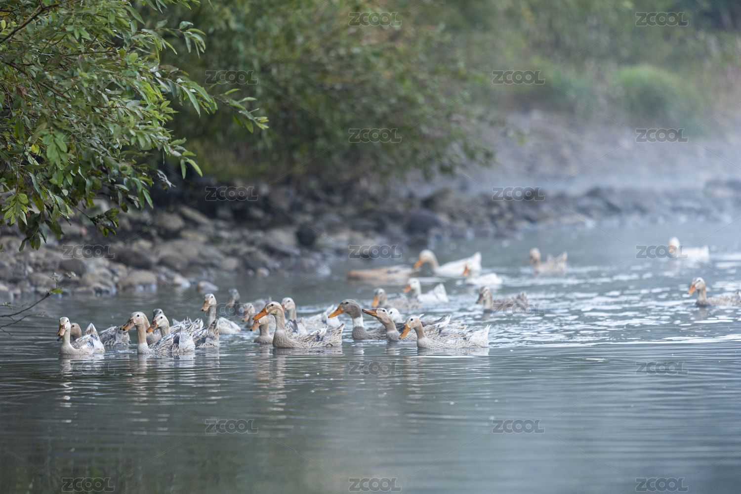 清晨在小河边自由觅食的鸭子