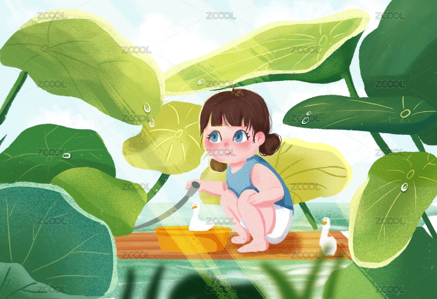 小女孩和小鸭子在荷叶底玩水