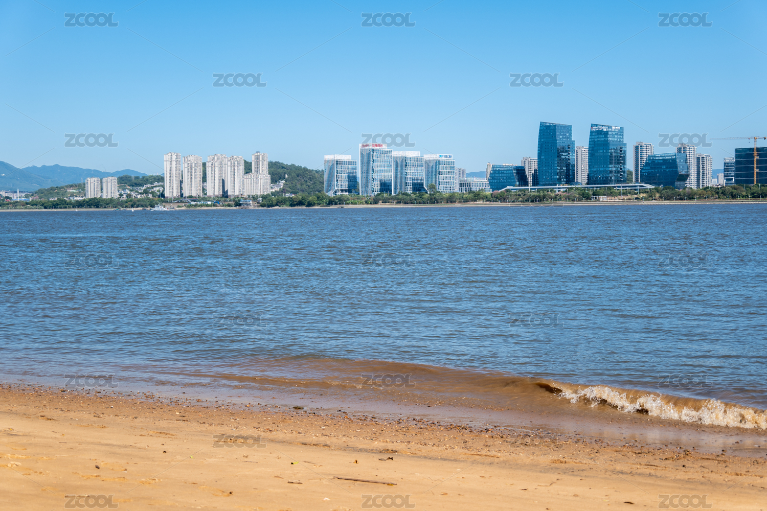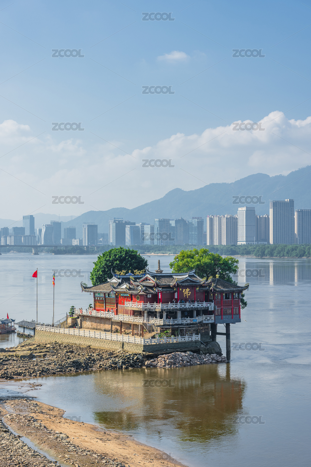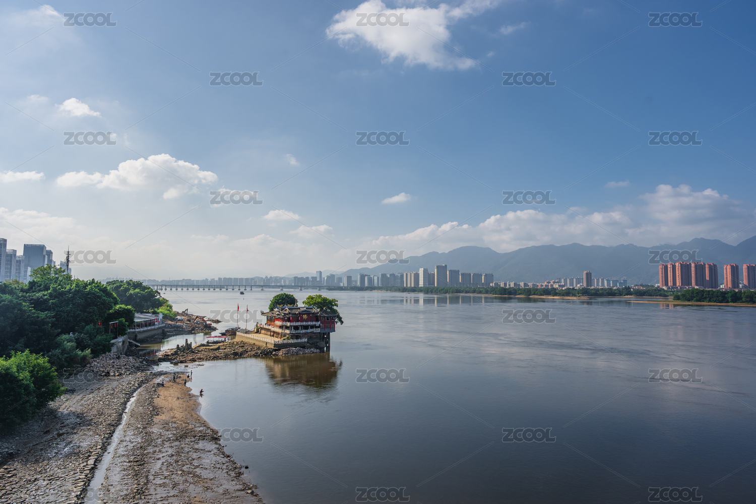 福州闽江的水面沙滩与现代化城市建筑发展