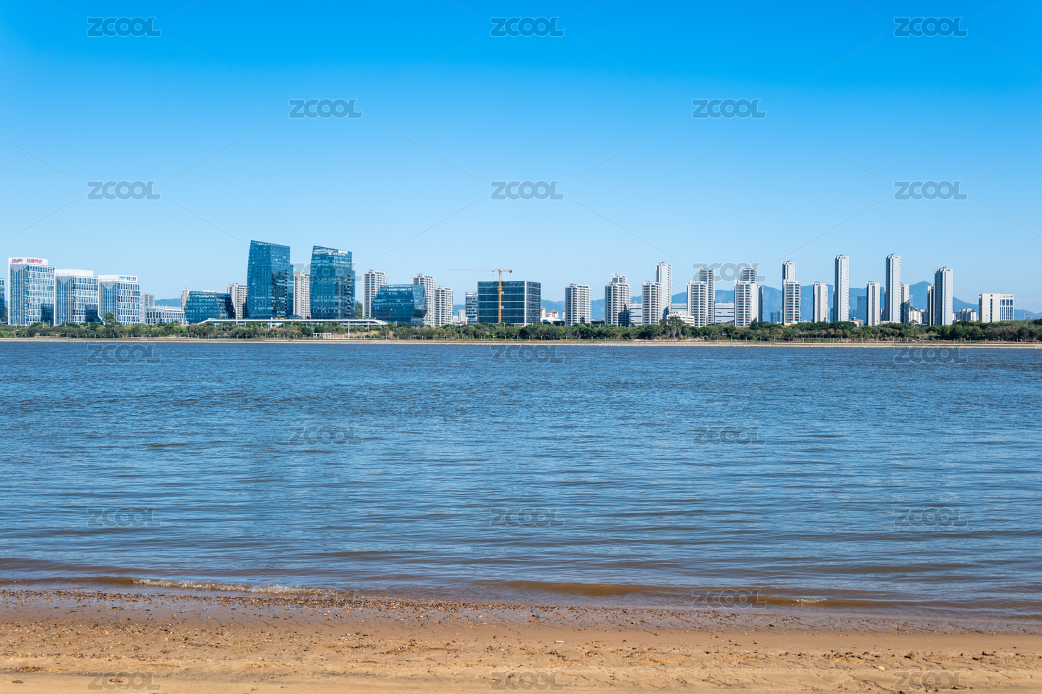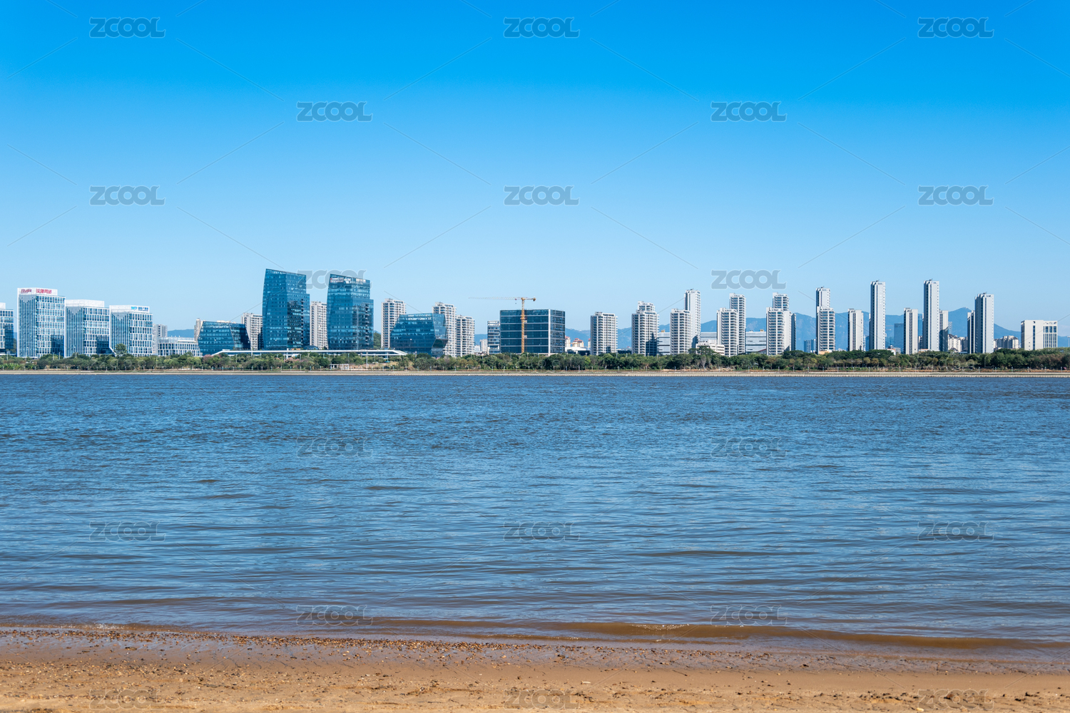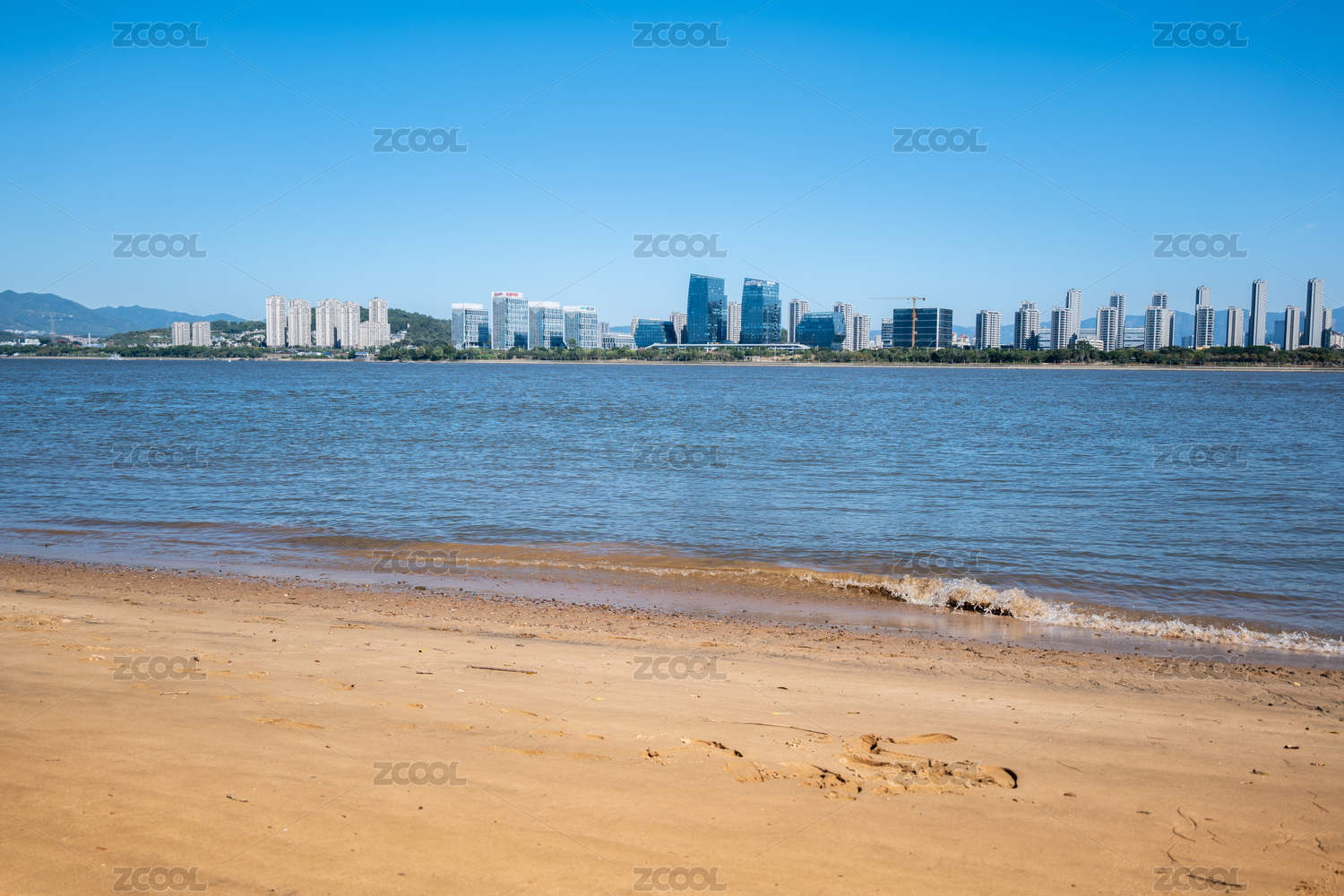 福州闽江的水面沙滩与现代化城市建筑发展