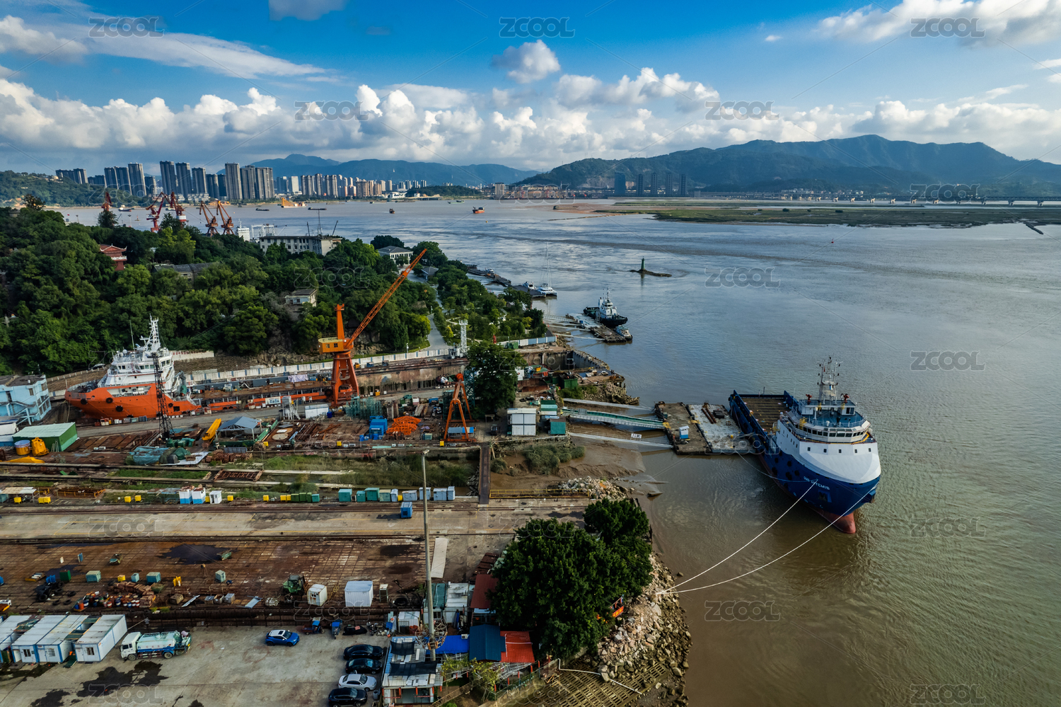 航拍晴天中的福州马尾闽江的码头和造船厂
