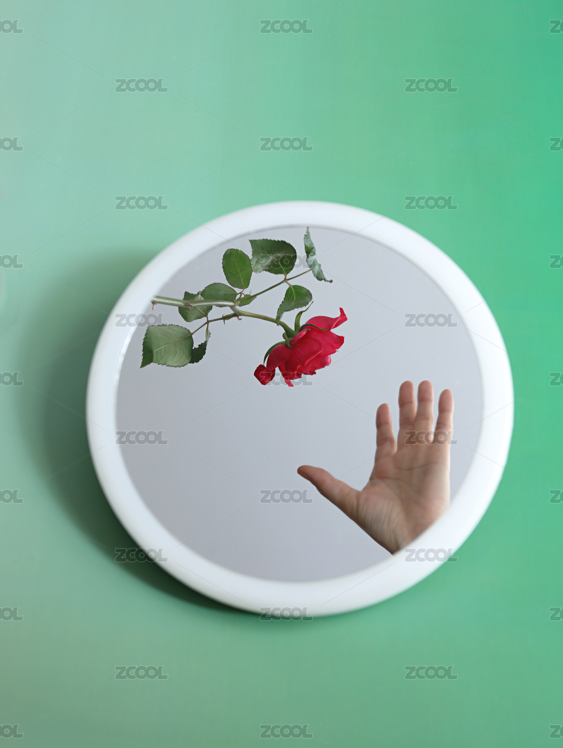 绿色背景上镜子中一只手伸过去拿红色玫瑰花