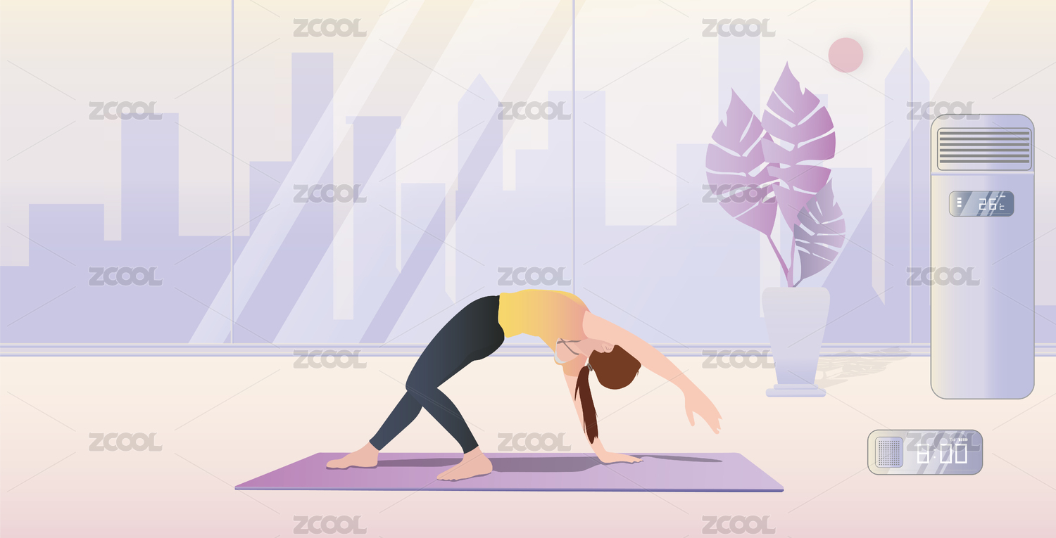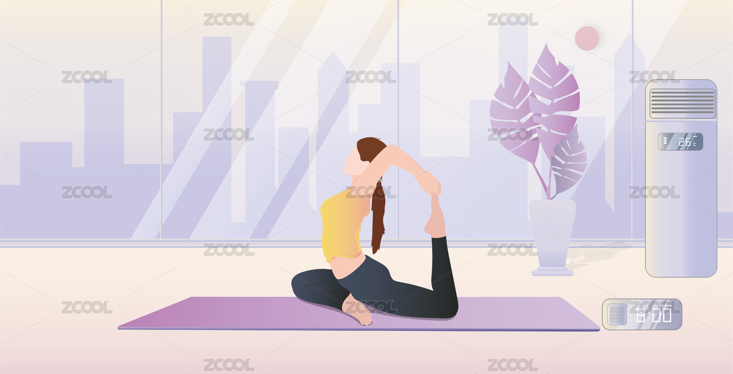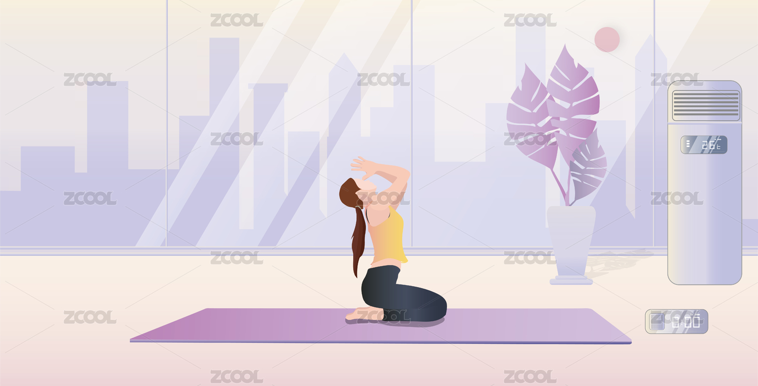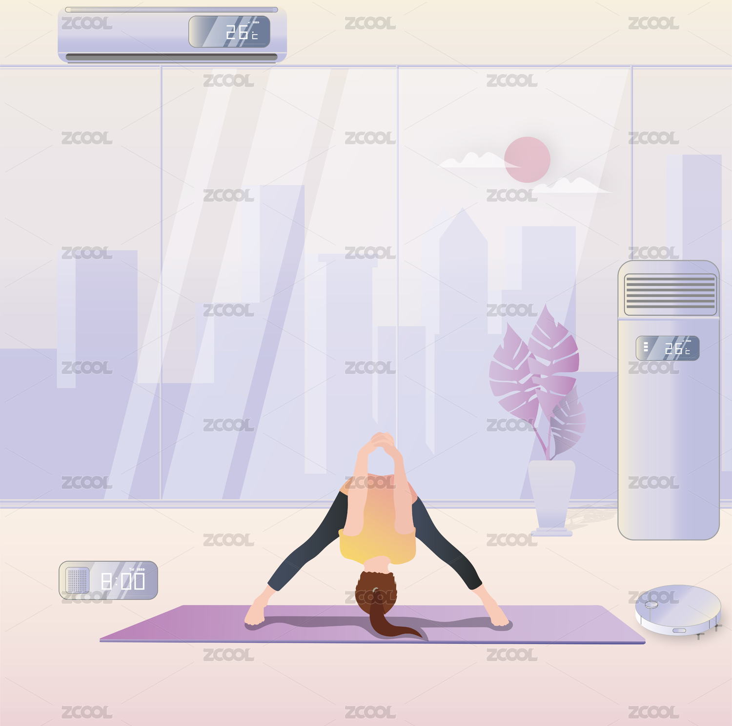 美丽时尚的年轻单身女孩在健身房室内练瑜伽锻炼身体,一边开着智能空调感受科技带来的乐趣插画背景海报