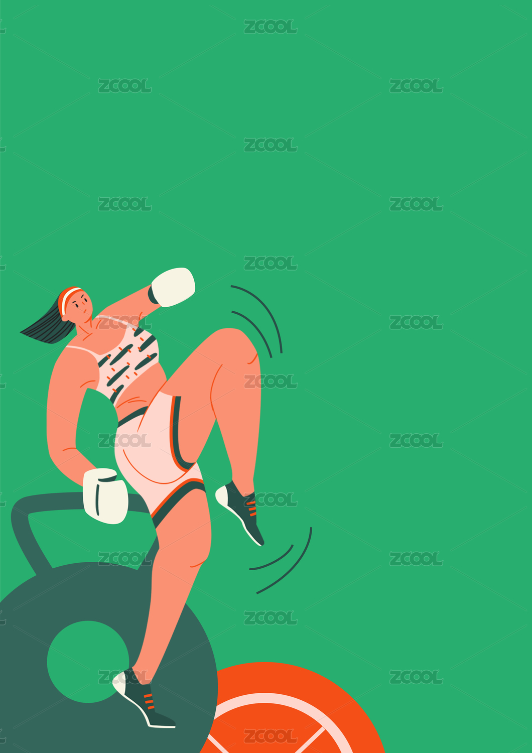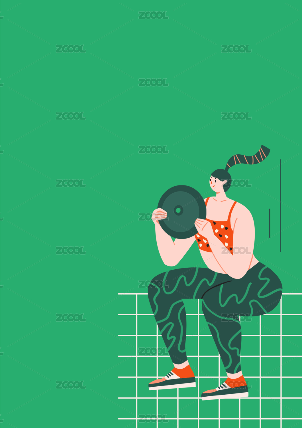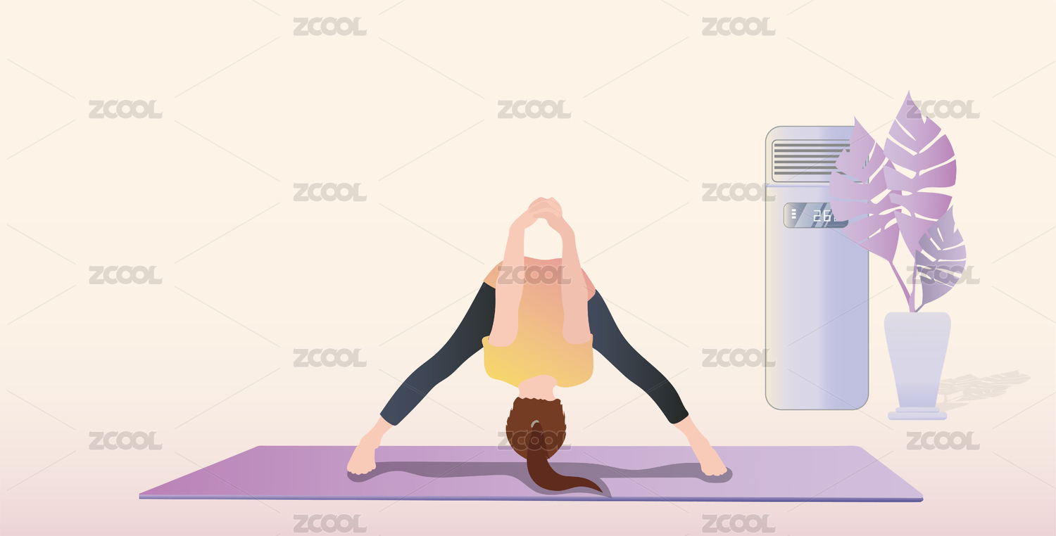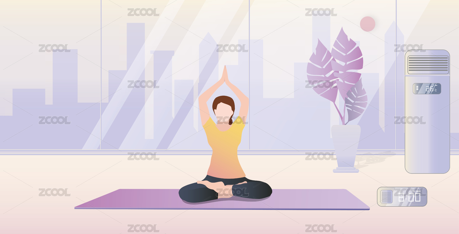 美丽时尚的年轻单身女孩在健身房室内练瑜伽锻炼身体,一边开着智能空调感受科技带来的乐趣插画背景海报