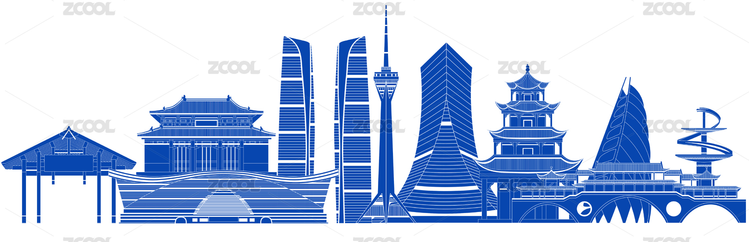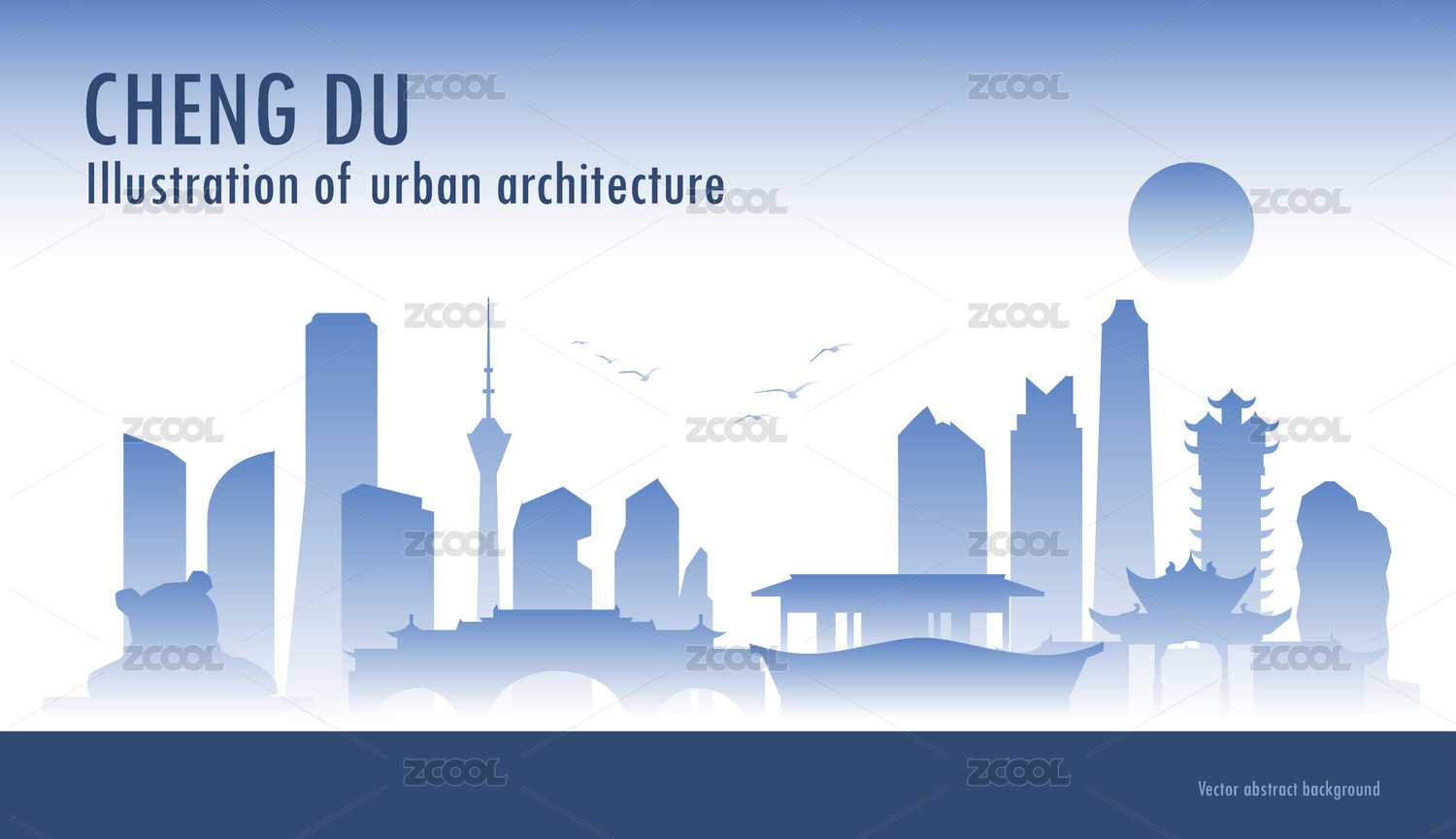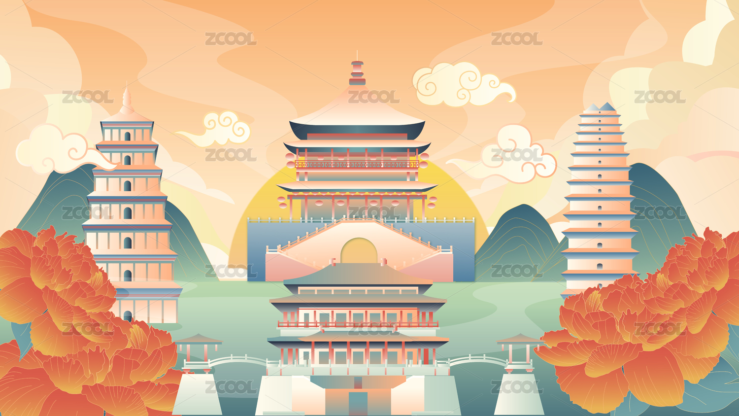中国风祥云山水牡丹西安古都城市建筑矢量插