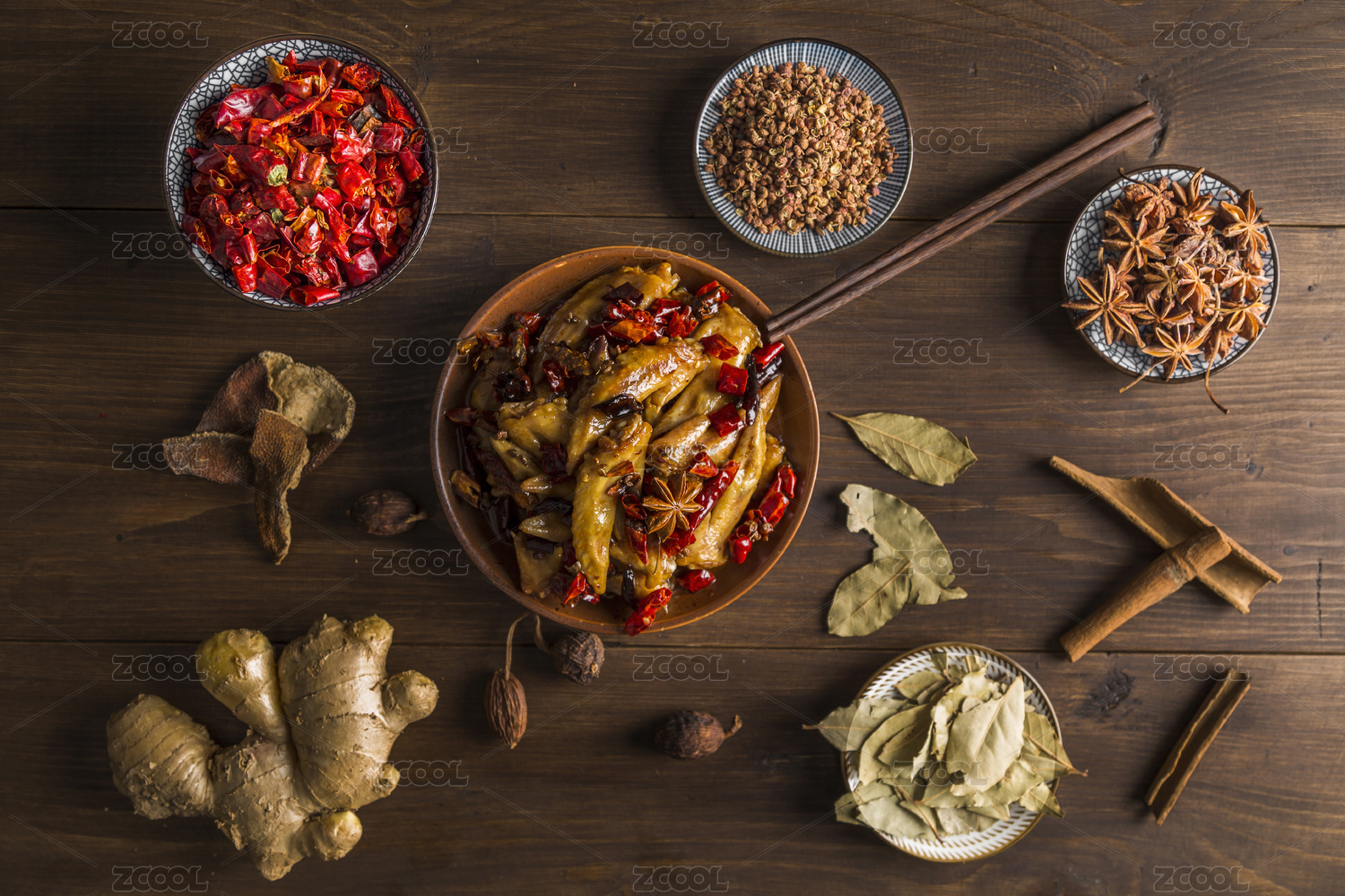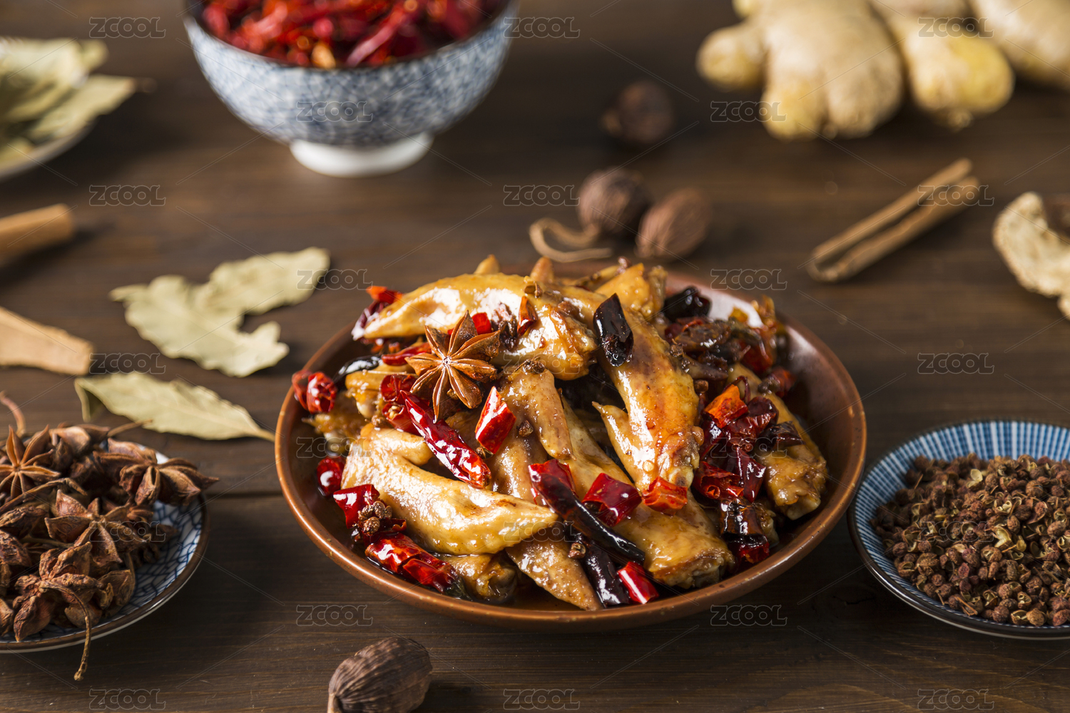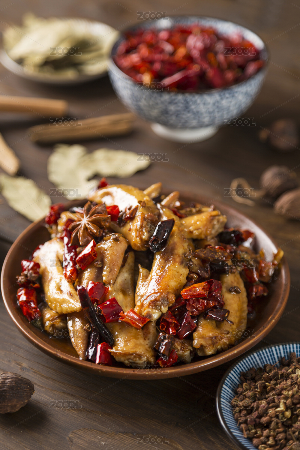 营养开味的麻辣鸡翅尖和各种香辛调味料