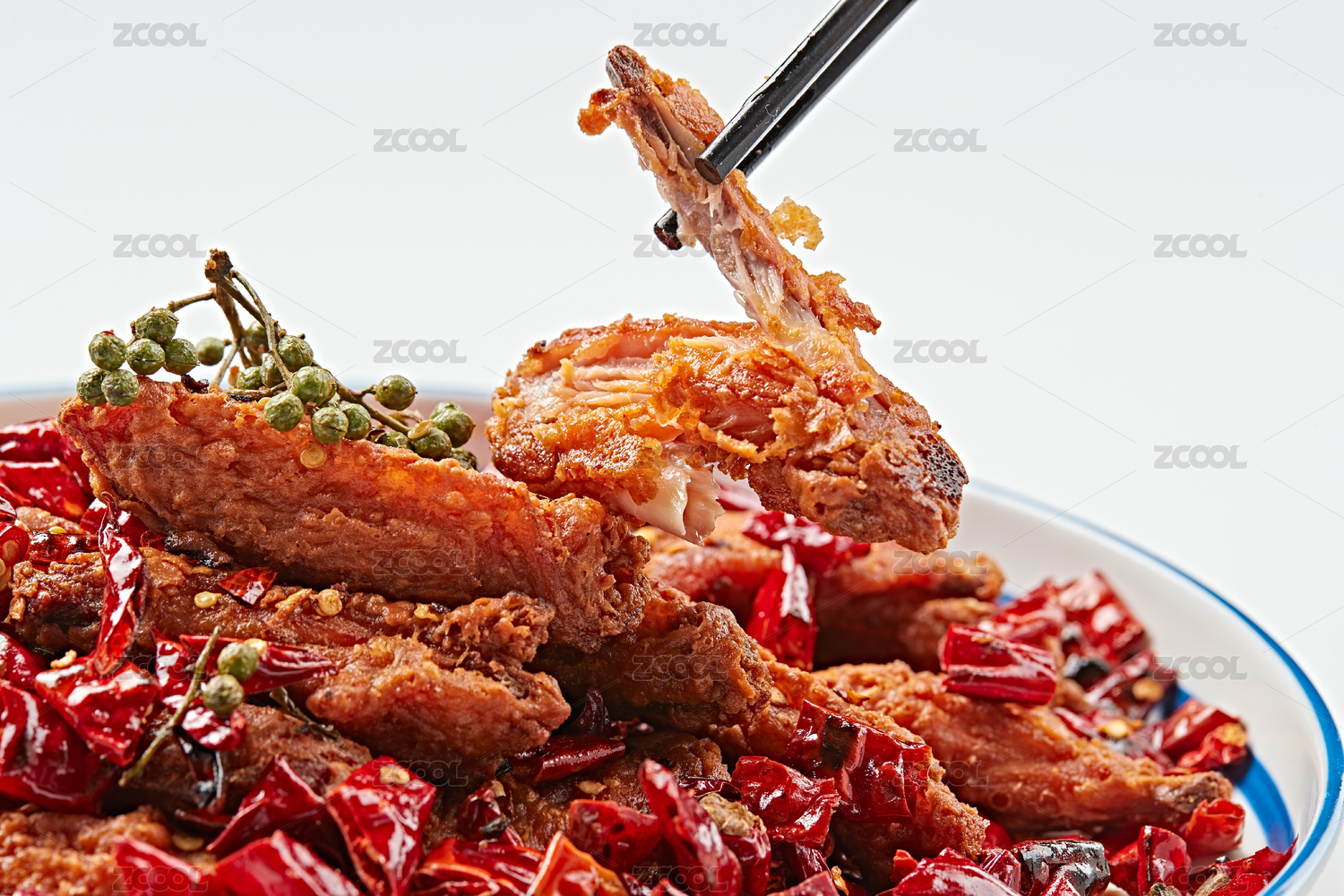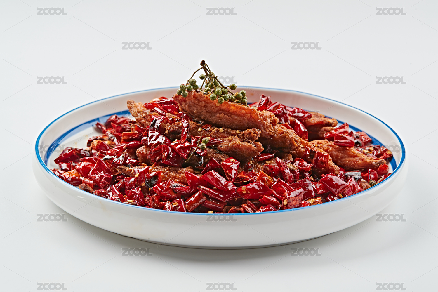 白色瓷盘装的川香油炸麻辣鸡翅中
