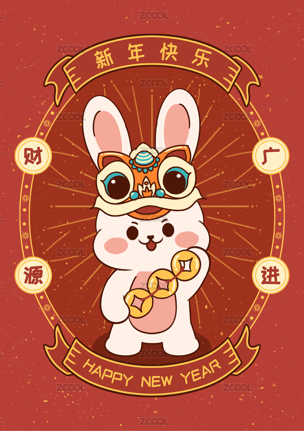 醒狮兔庆贺新年举金币财源广进