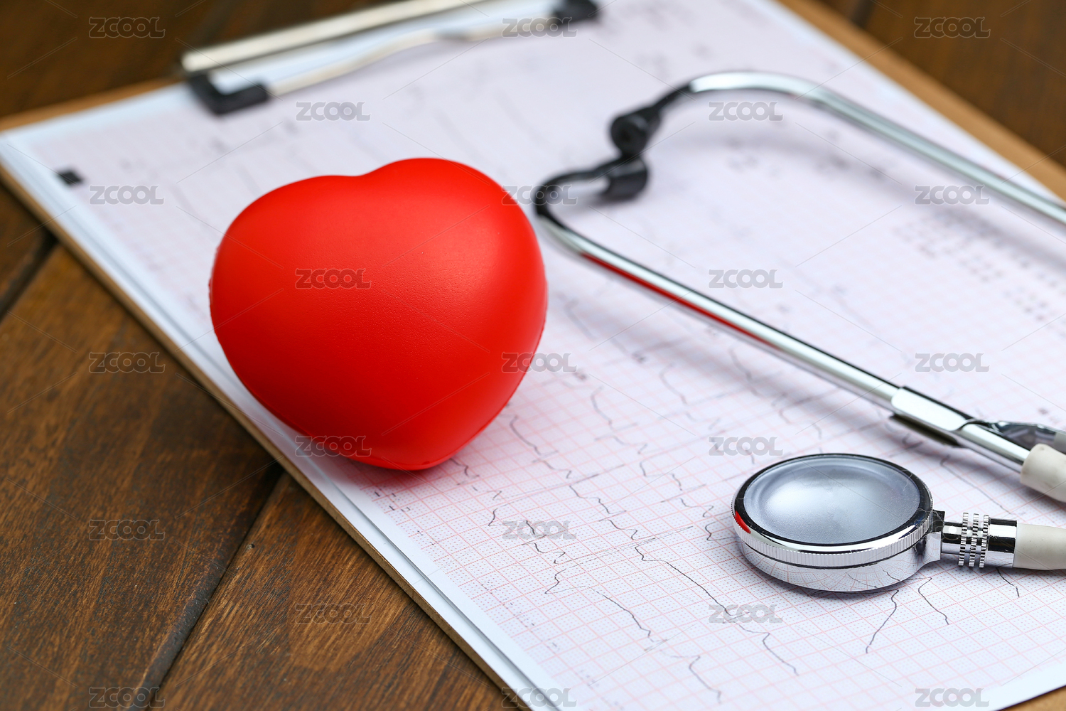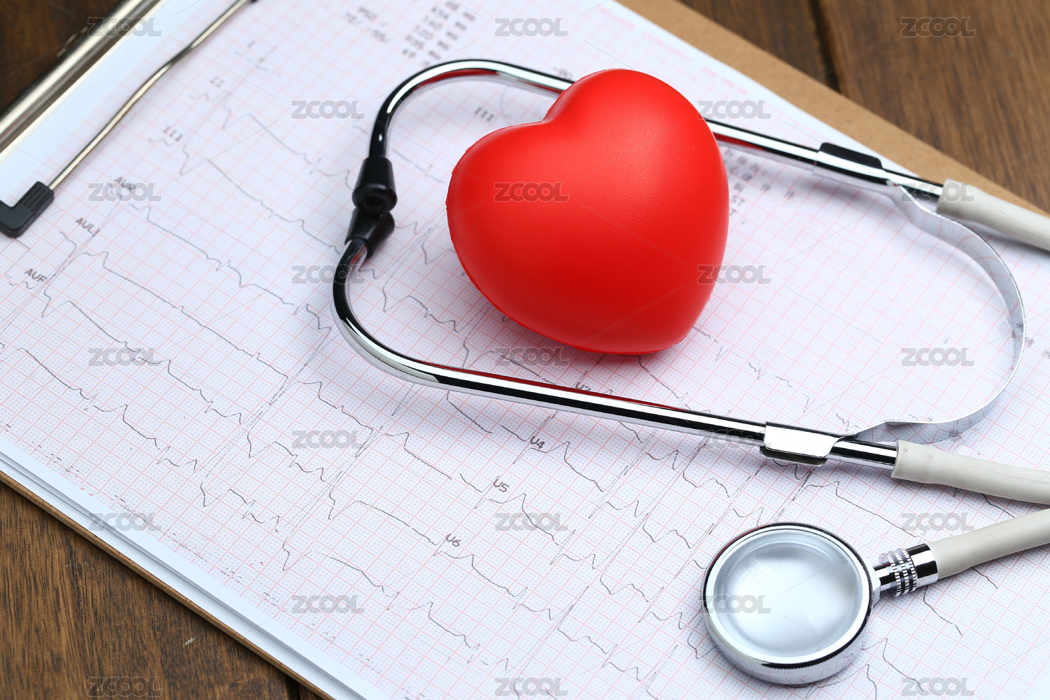 红心和听诊器放在心电图背景上