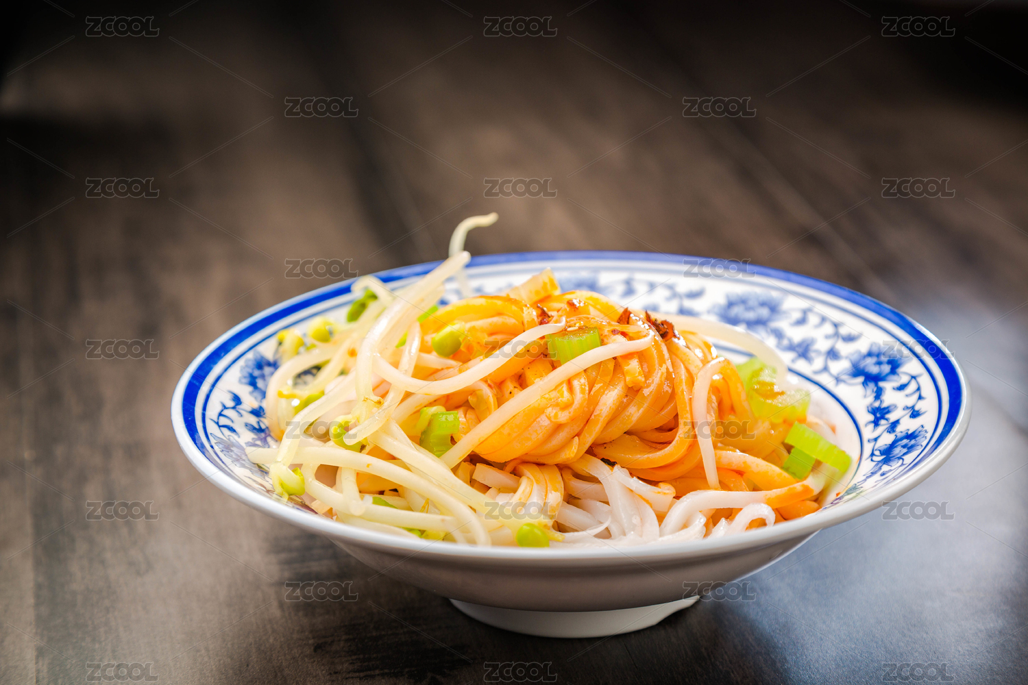 木桌背景的西兰花瘦肉凉拌麻辣米皮的