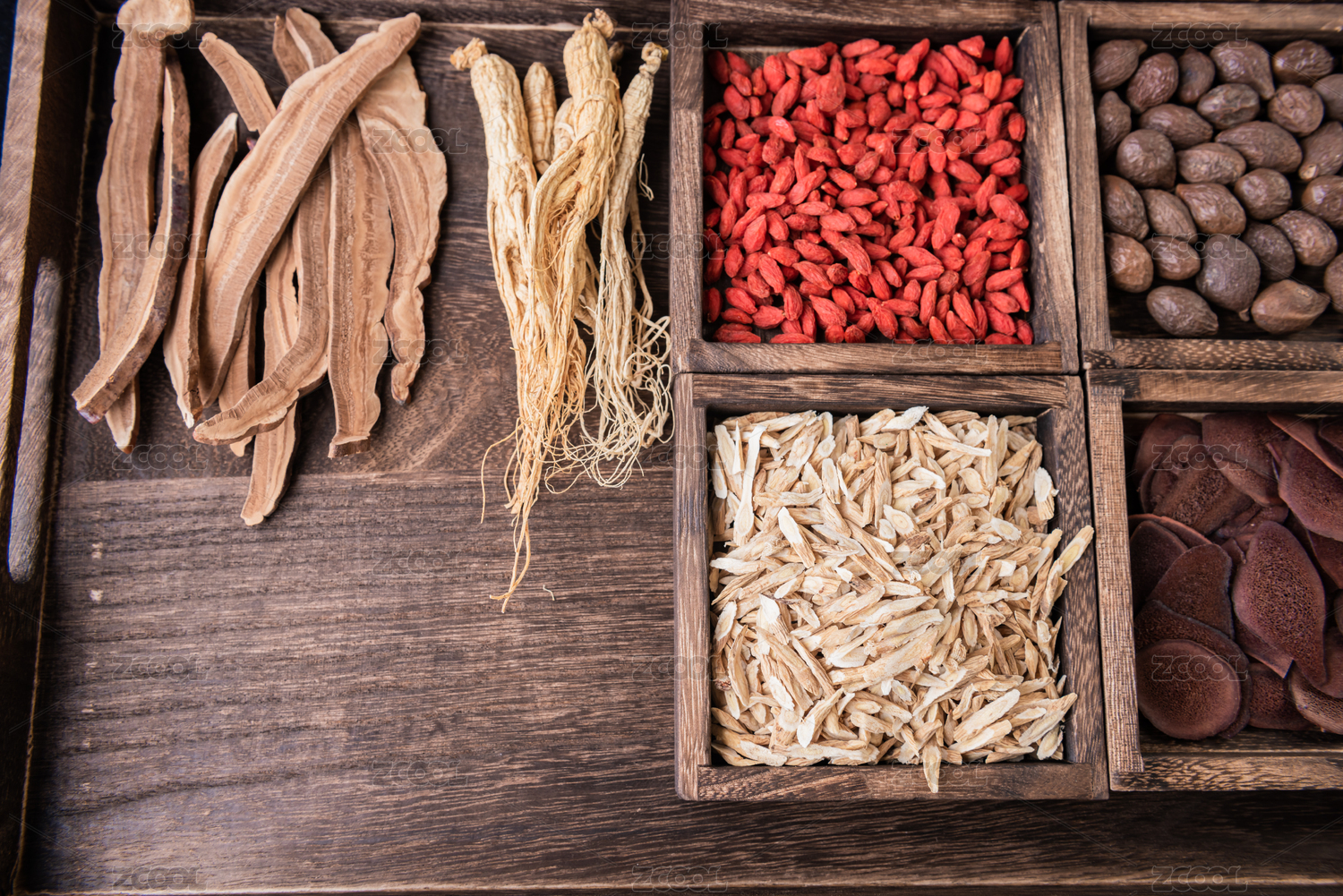 桌子上陈列的中药材人参鹿茸黄芪灵芝片等
