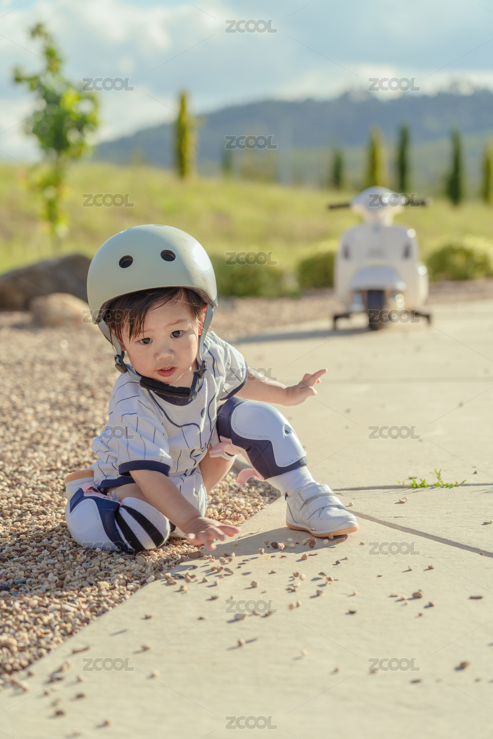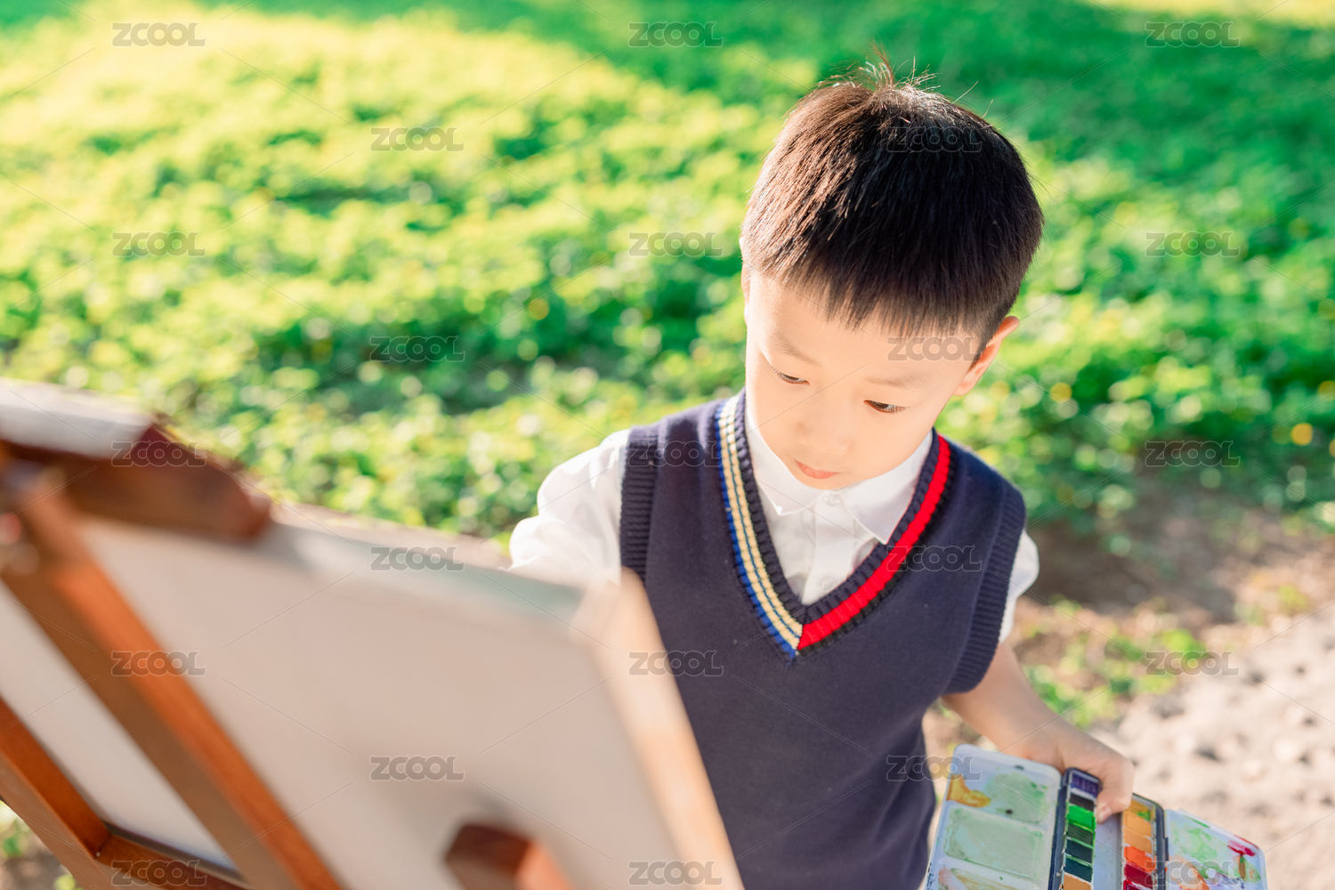 春天户外亚洲中国男孩手拿画笔在画板上画画