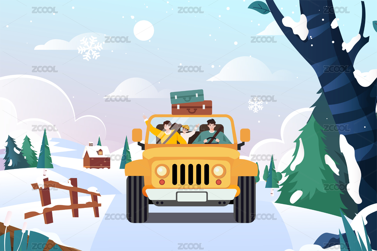 冬天自驾旅行插画