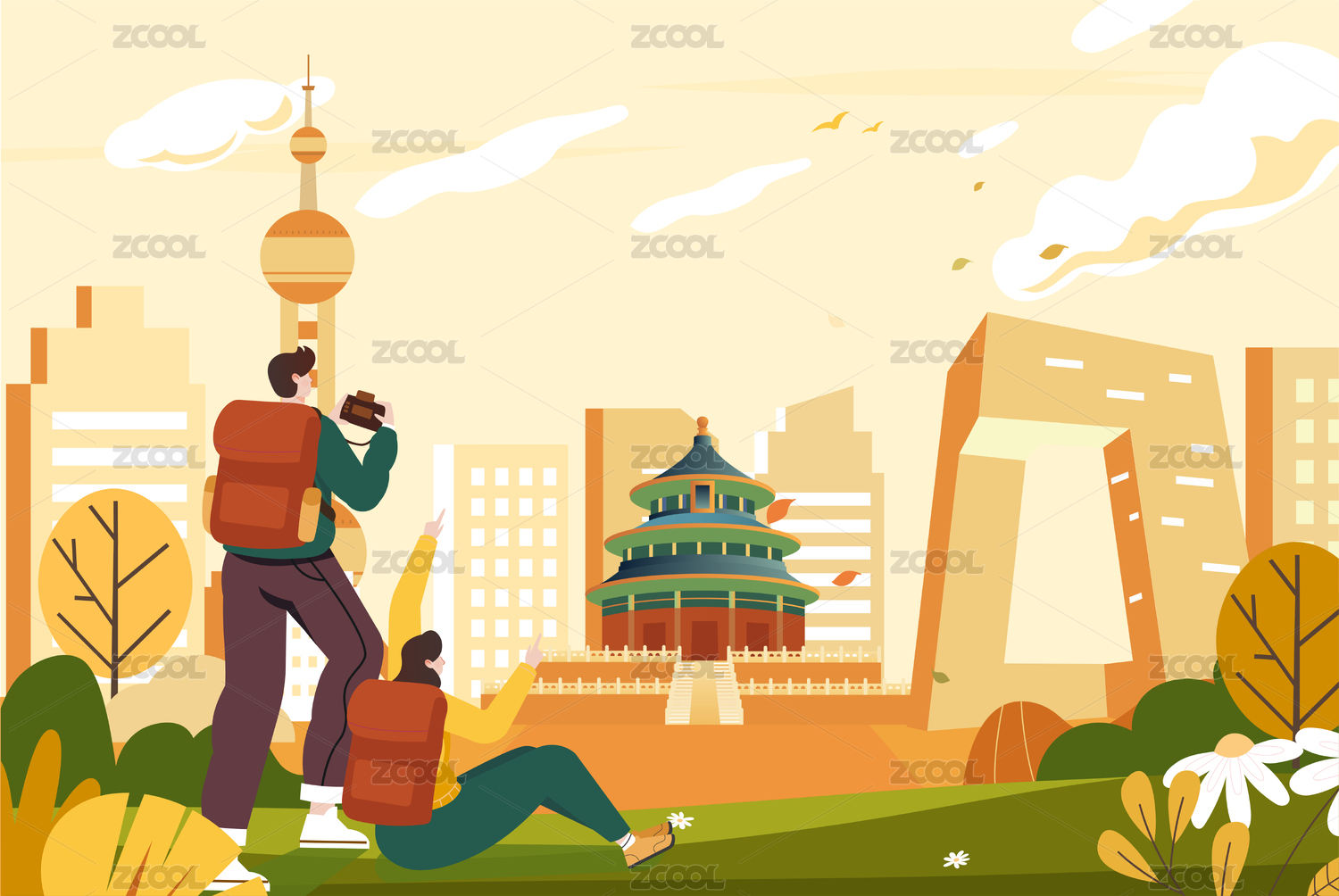 国庆城市旅行插画