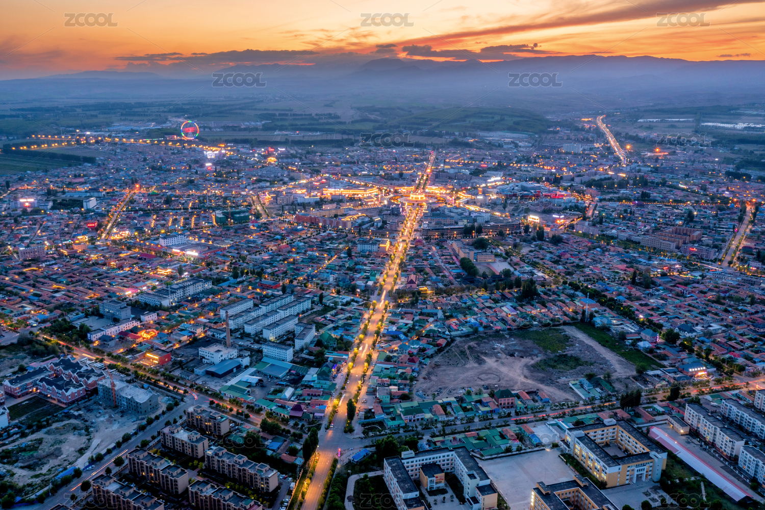 航拍黄昏时分的中国新疆伊犁特克斯县八卦城