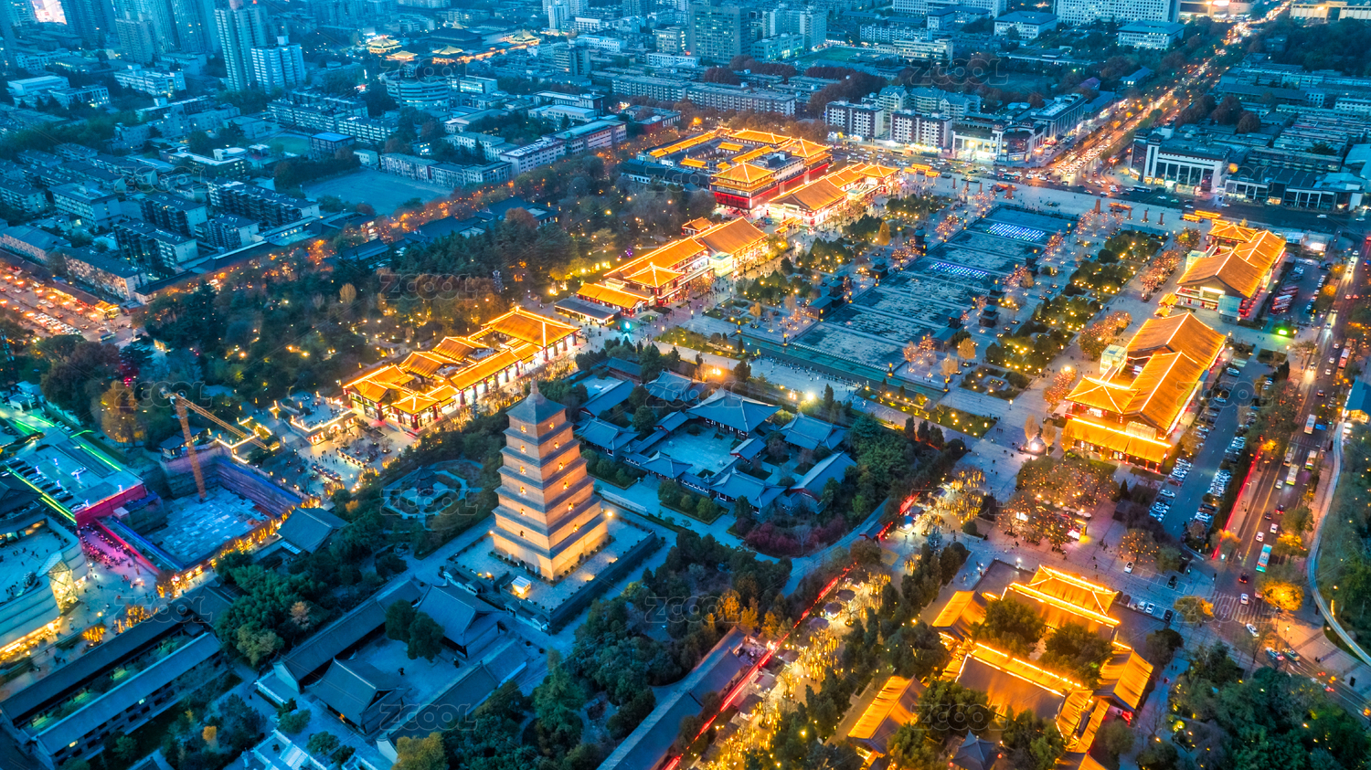 航拍西安大雁塔大唐不夜城现代都市风光夜景
