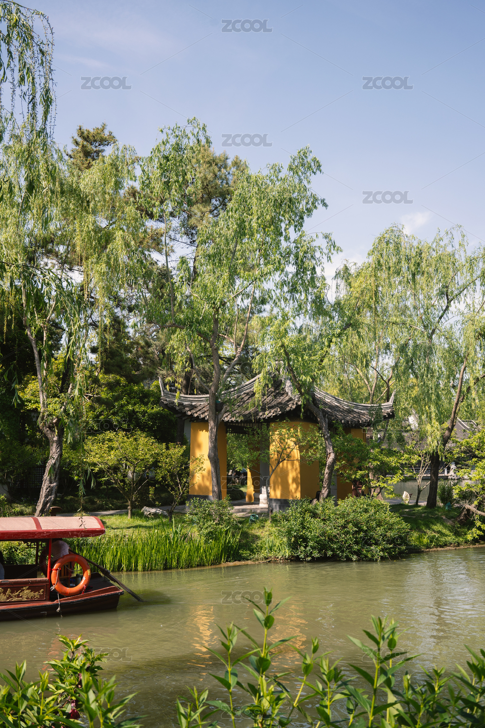 湖面黄色亭子岸边柳树