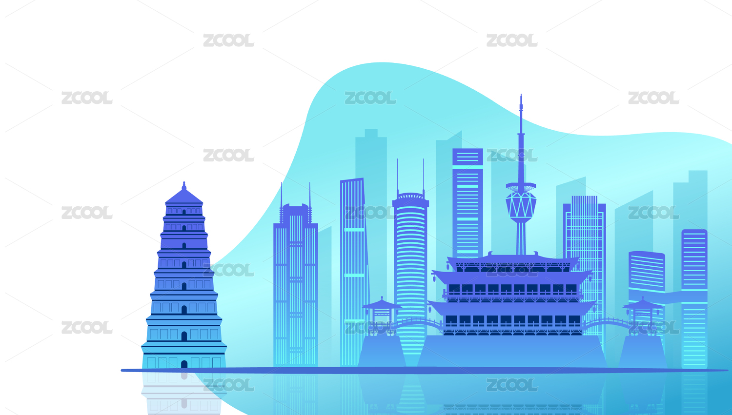 中国陕西西安市城市天际线矢量插画蓝色
