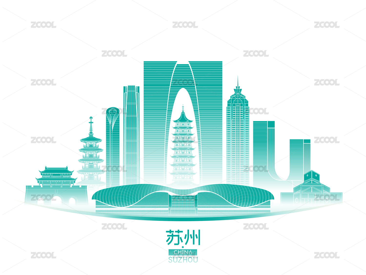 苏州城市建筑群天际线矢量插画海报