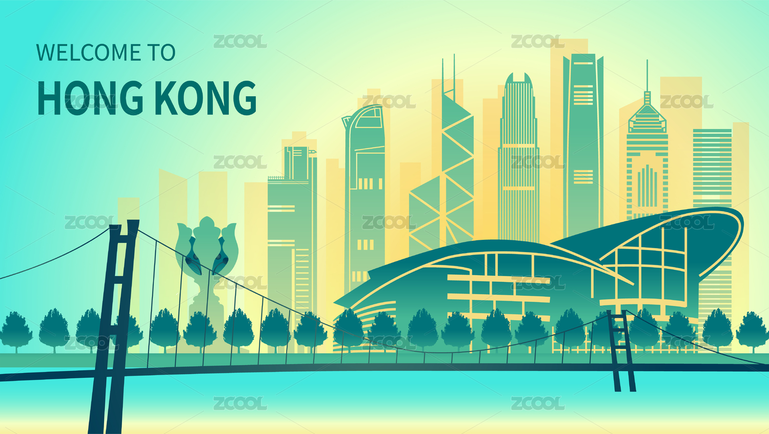 中国香港城市天际线矢量插画绿色