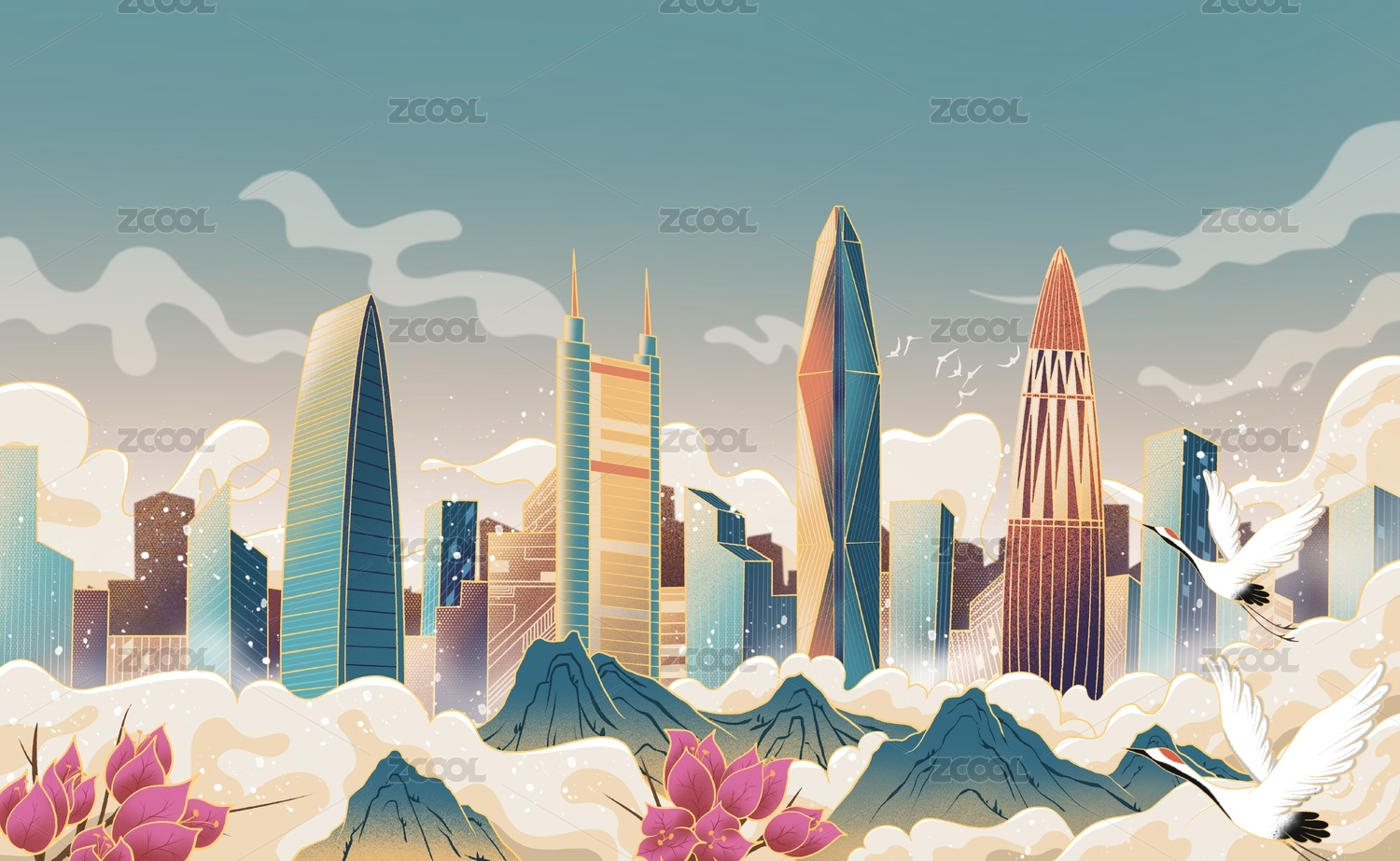 中国深圳城市天际线国潮插画