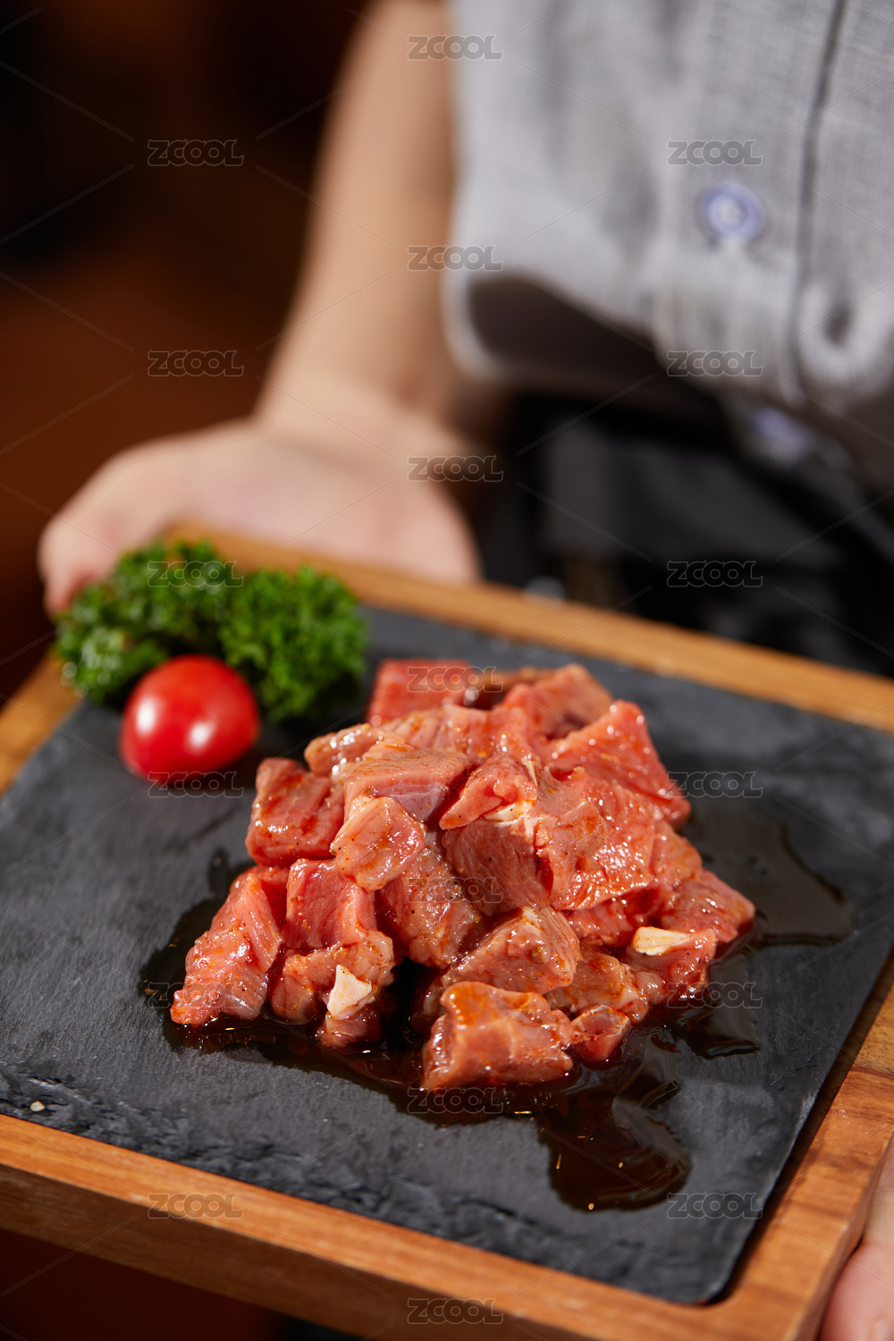 雪花牛肉粒放在有干冰的黑色盘子上