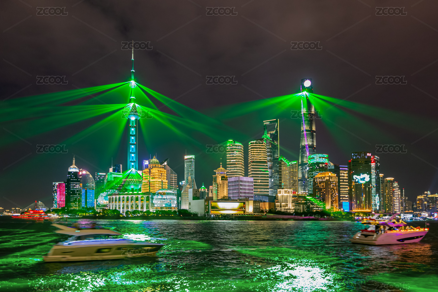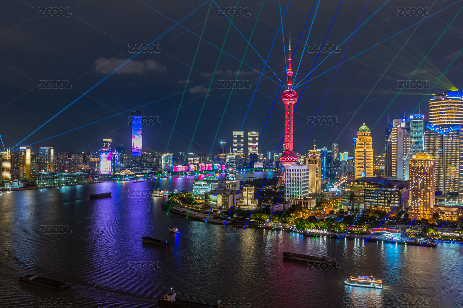 国庆节期间中国上海外滩及陆家嘴进行灯光秀表演