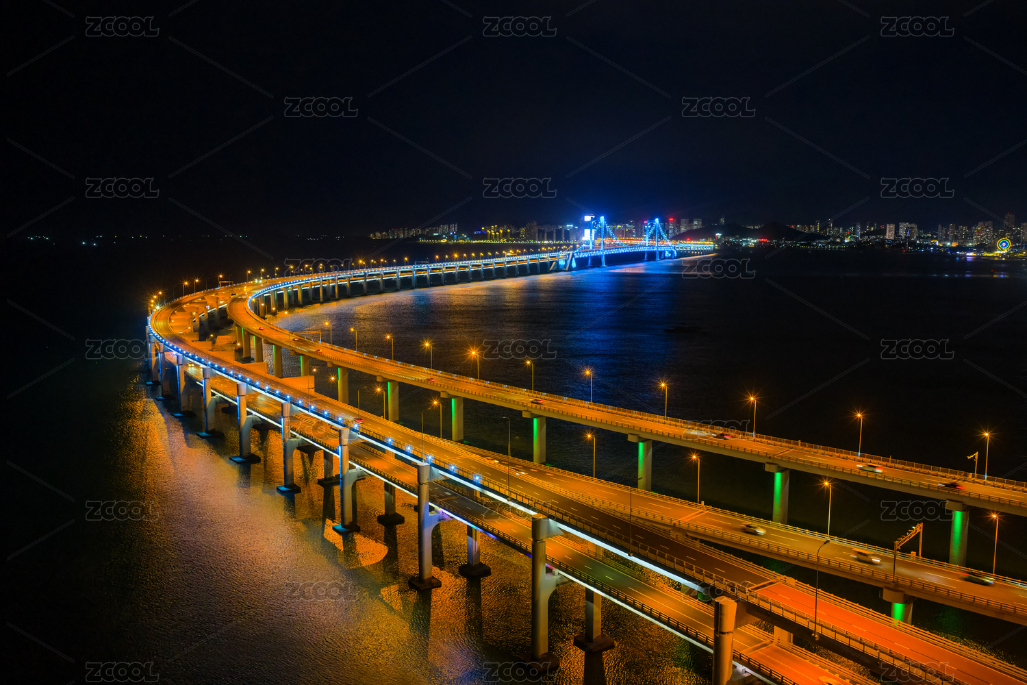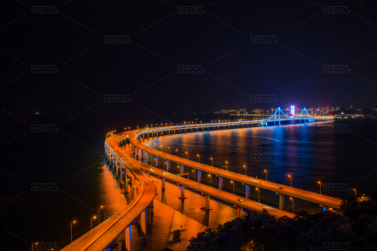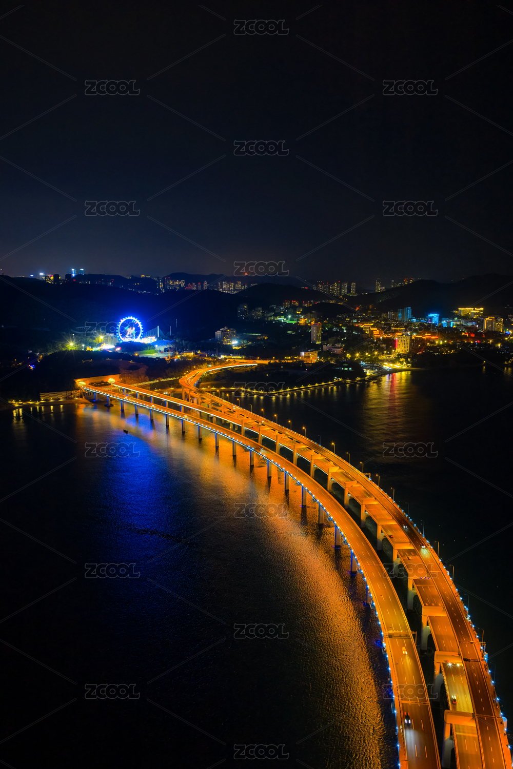 航拍大连星海湾跨海大桥夜景灯光秀星海广场