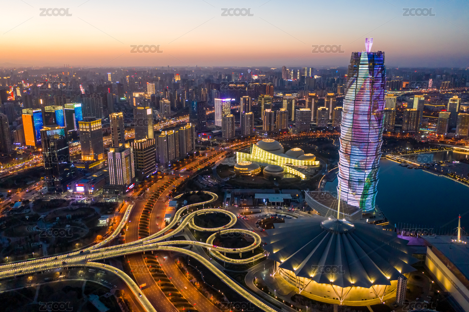 航拍郑州CBD大玉米楼夜景炫彩楼体灯光秀