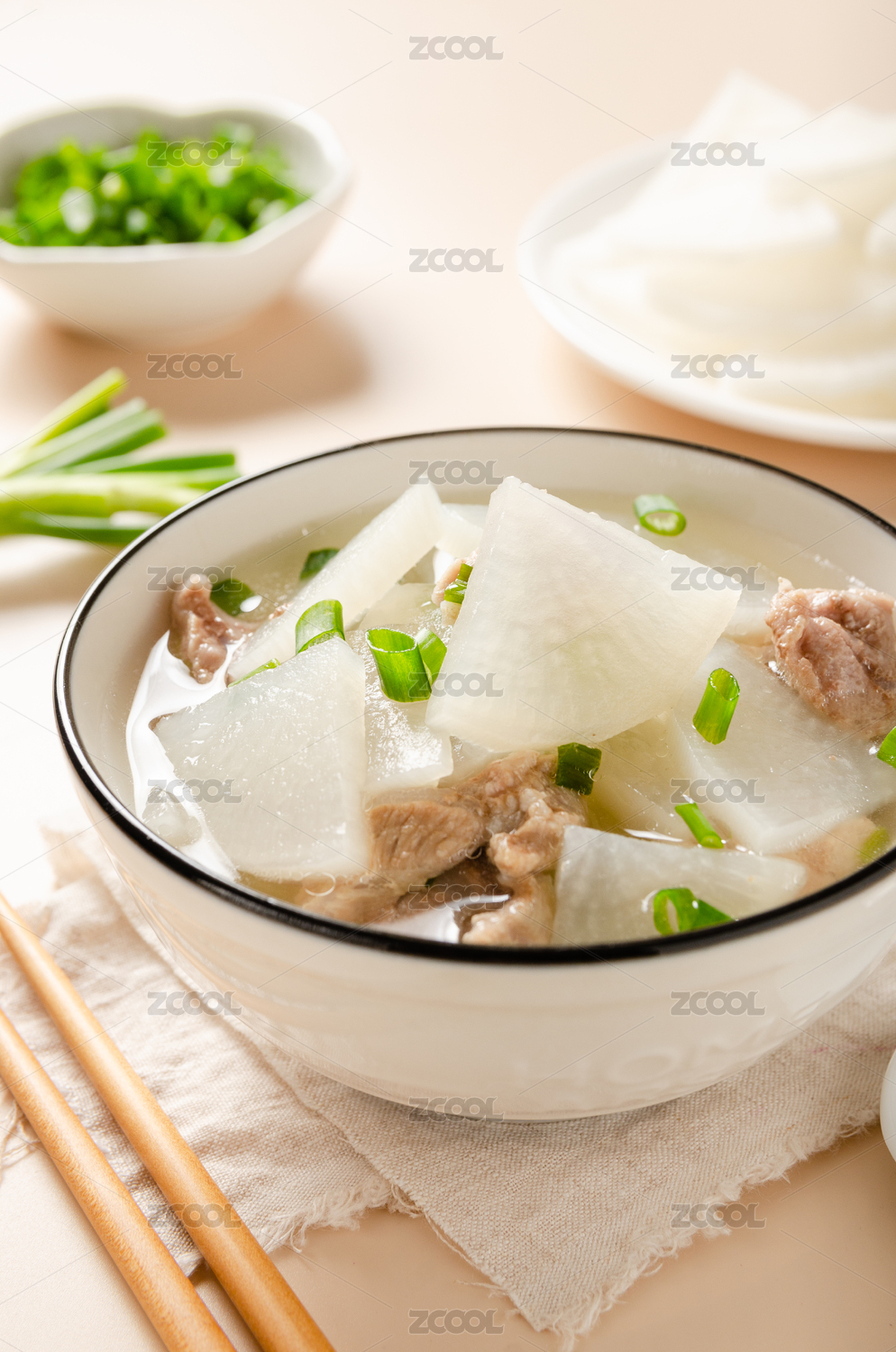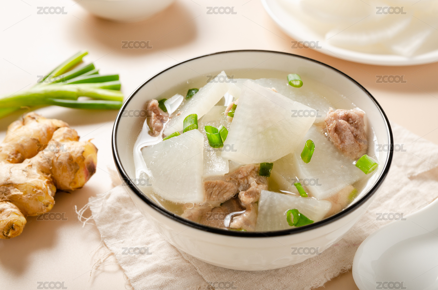 瓷碗里的猪肉萝卜汤