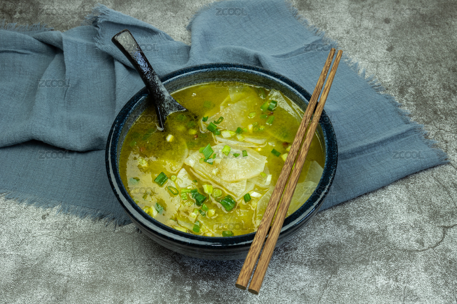 灰色背景上瓷碗里的白萝卜汤