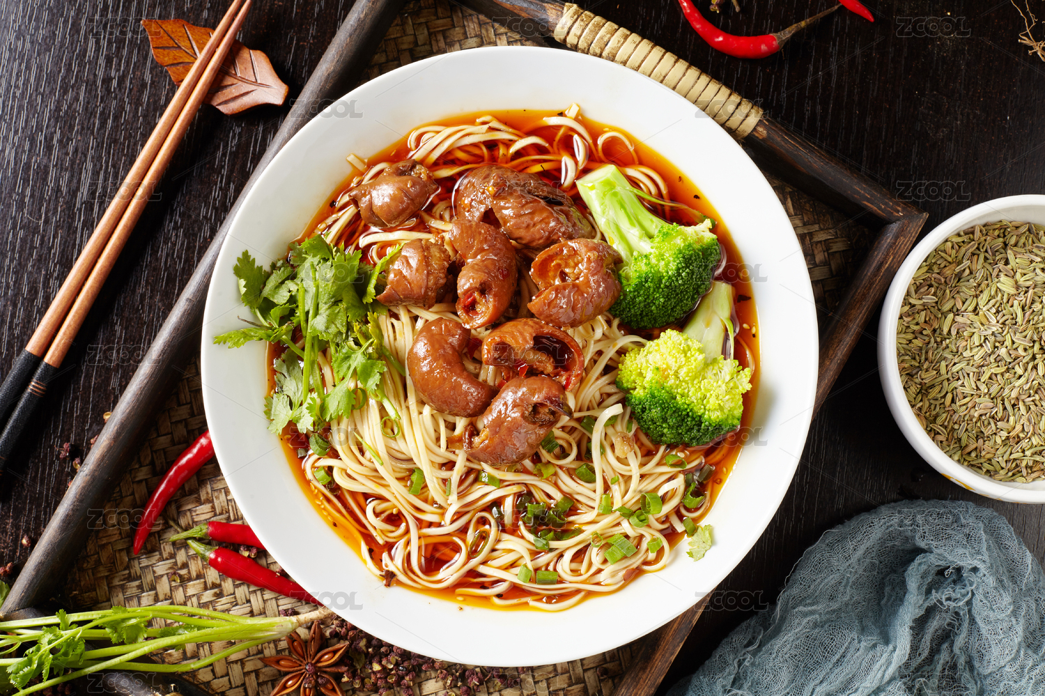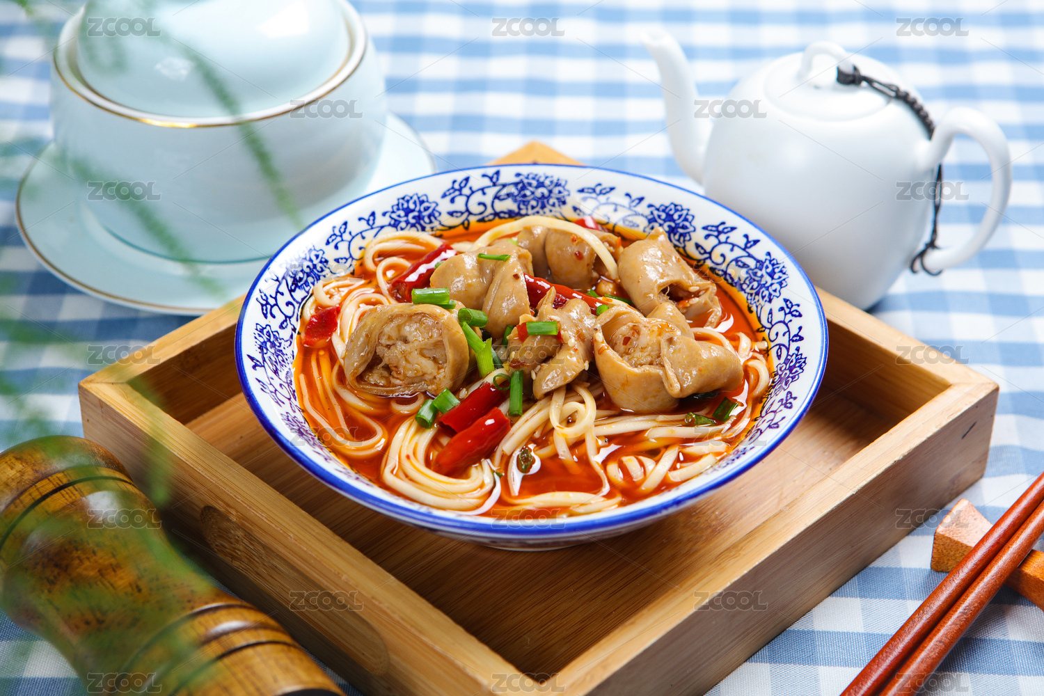 棕色木纹板上放着一碗肥肠面