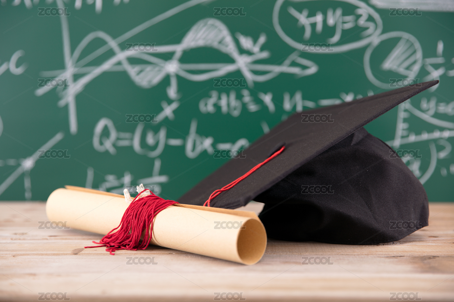 黑板前的博士帽和卷着的毕业证书及小房子模型