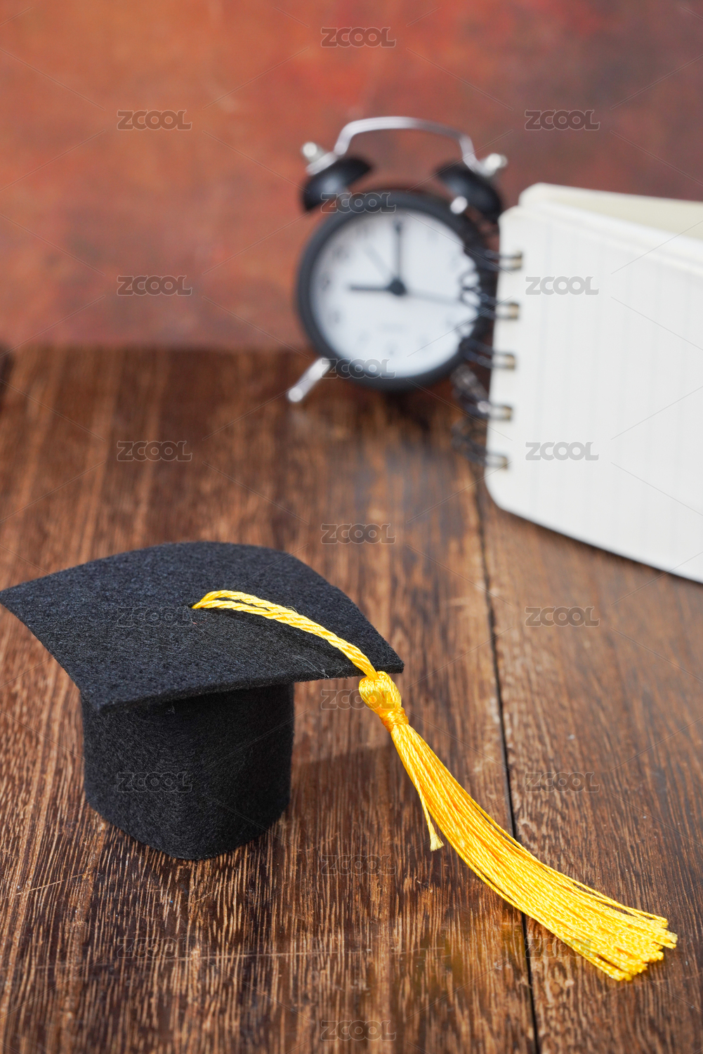 黑板前的博士帽和卷着的毕业证及一个闹钟