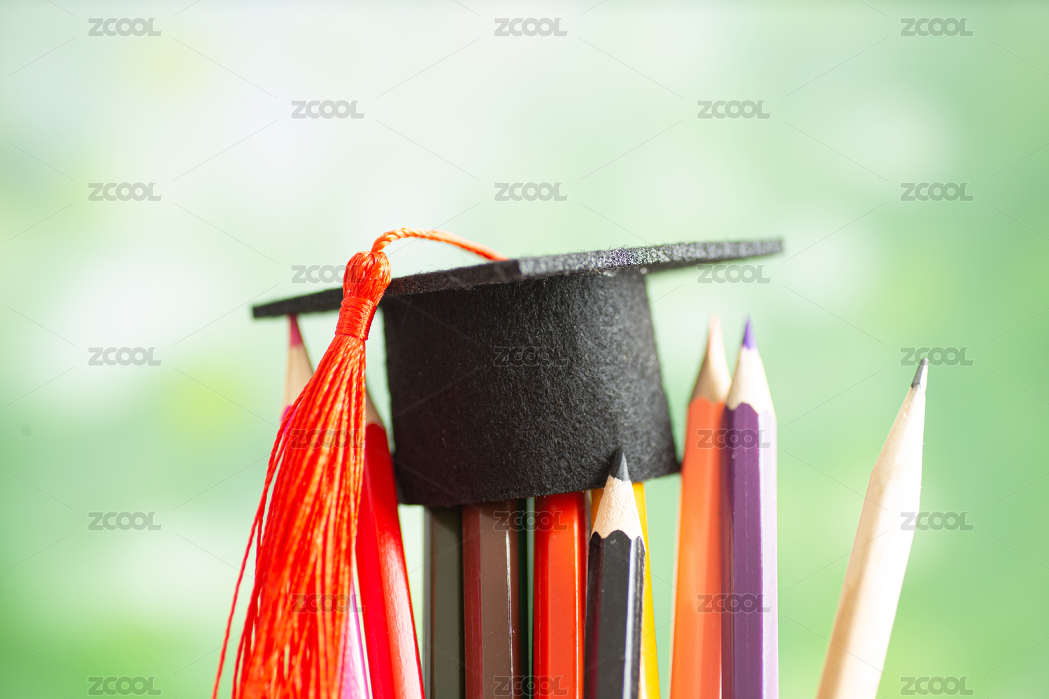 一个博士帽和卷着的毕业证及旁边的笔记本和笔