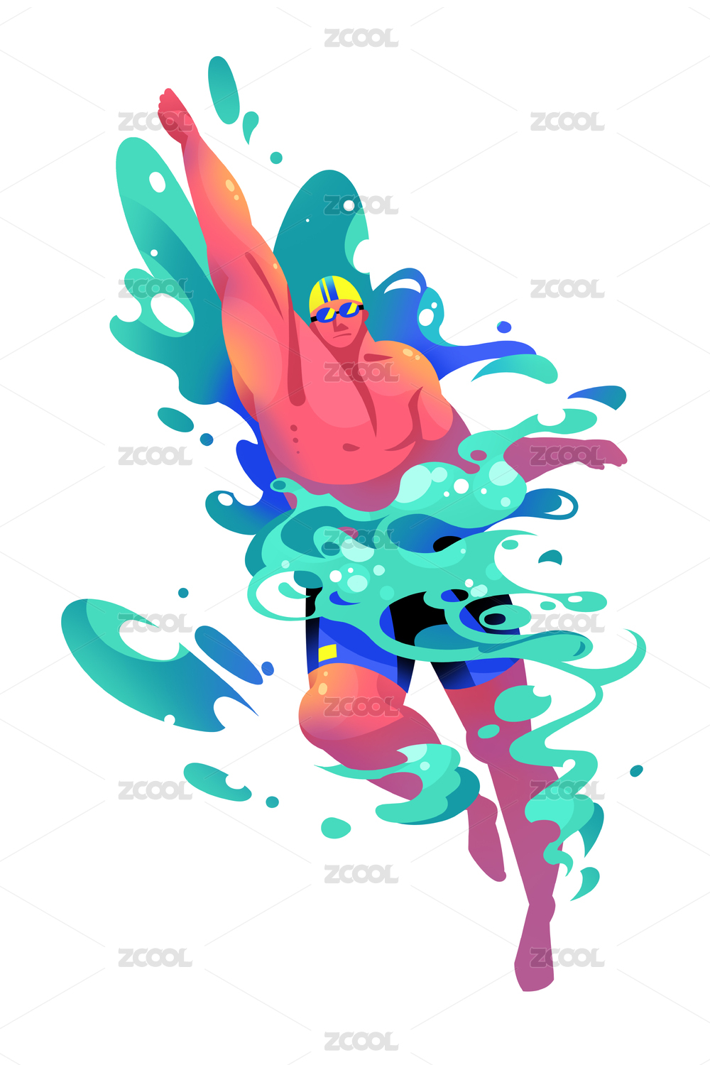 肌肉男在水中游泳溅起水花的插画
