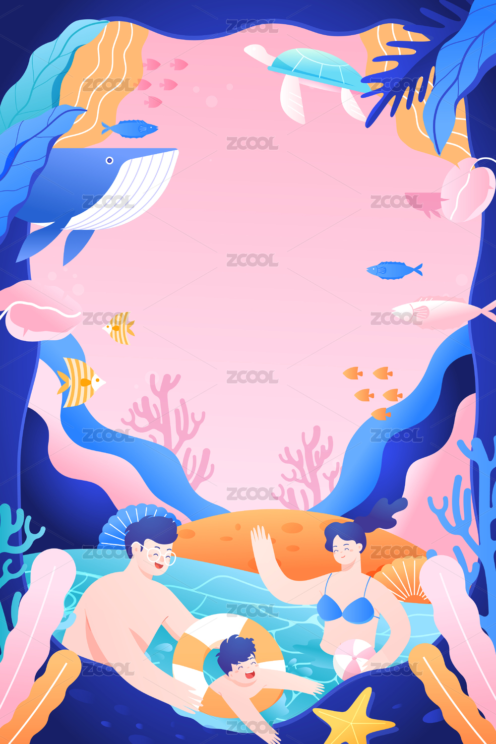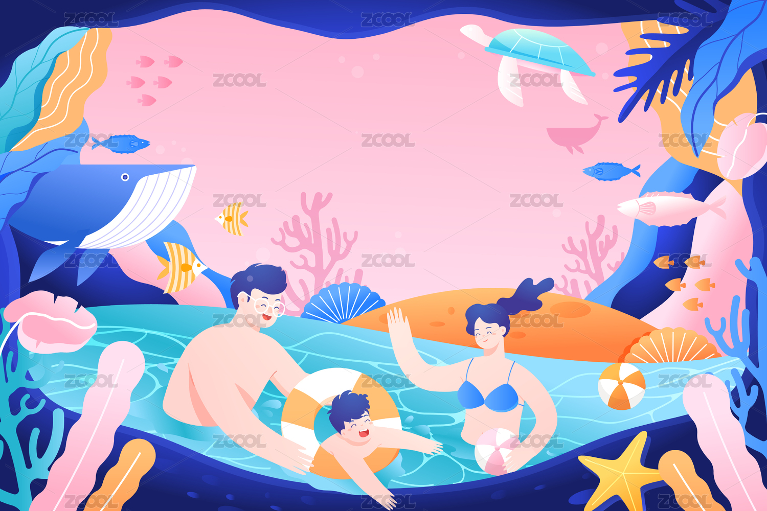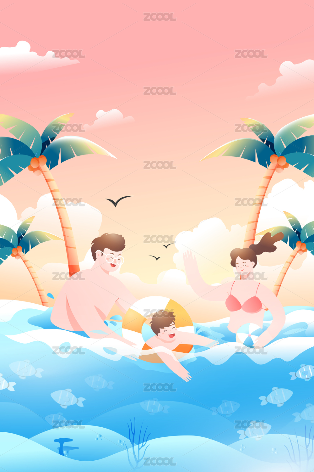 夏季亲子游泳矢量插画