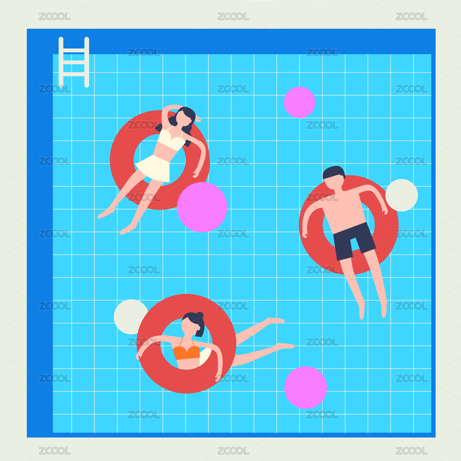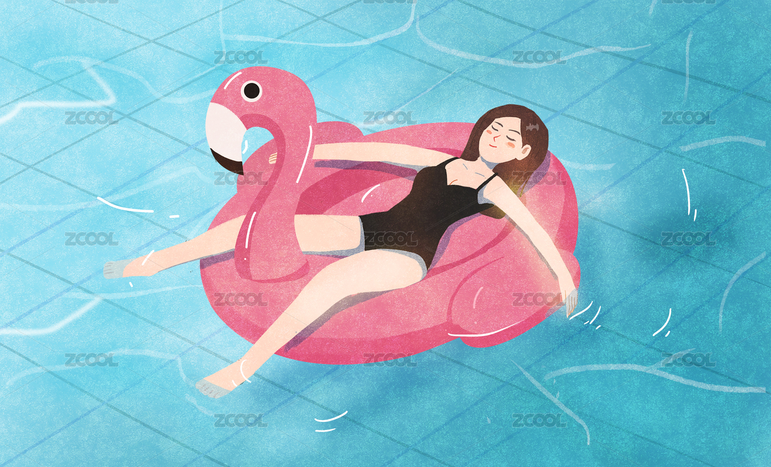 一个在带有游泳圈的泳池里游泳的女孩,夏日概念手绘插画