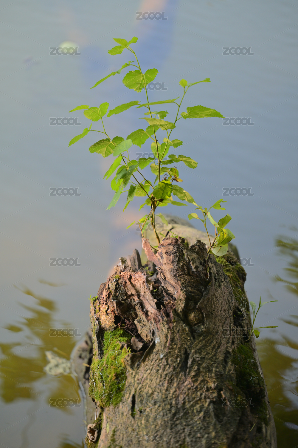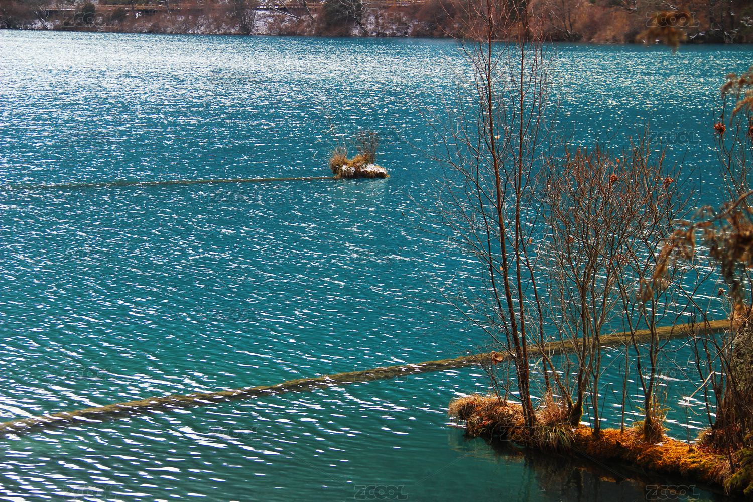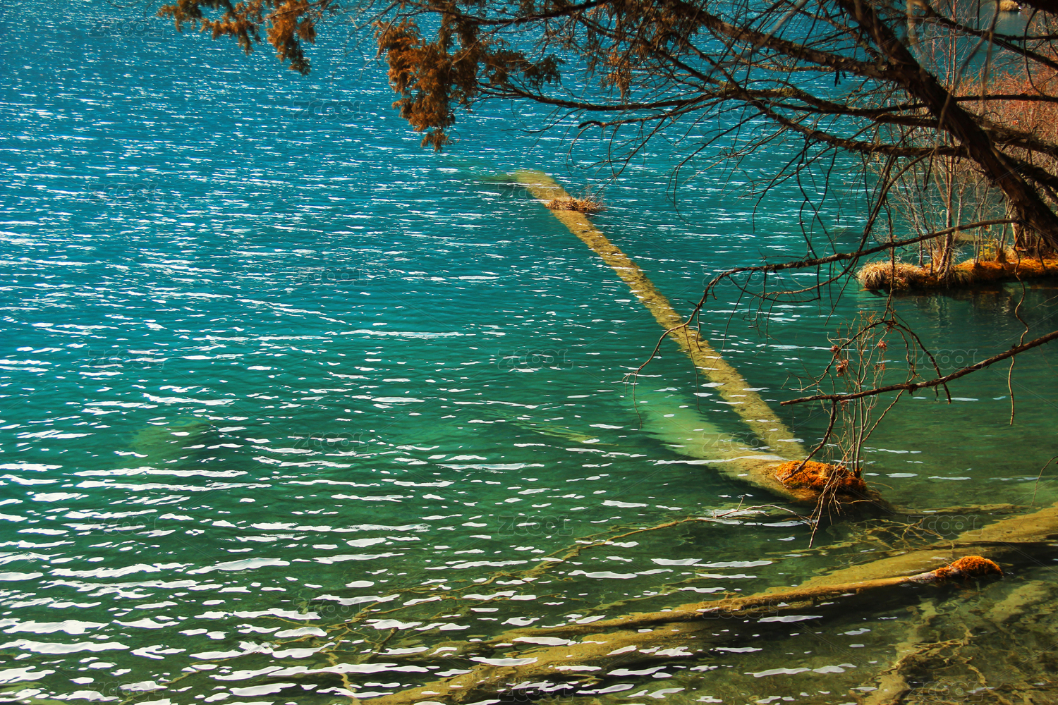 蓝绿色湖水与树枝