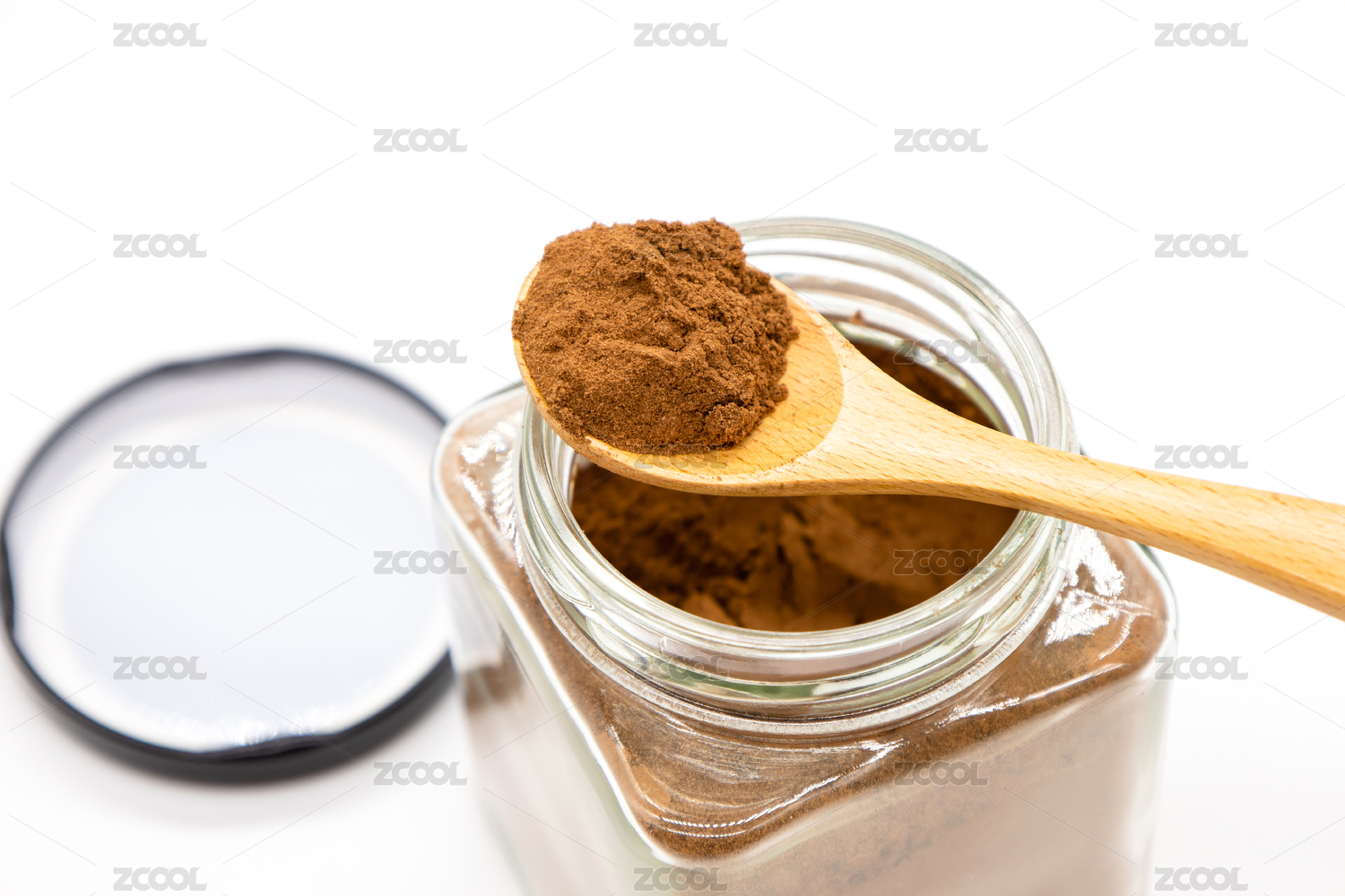 白背景玻璃瓶装着烘焙食材可可粉